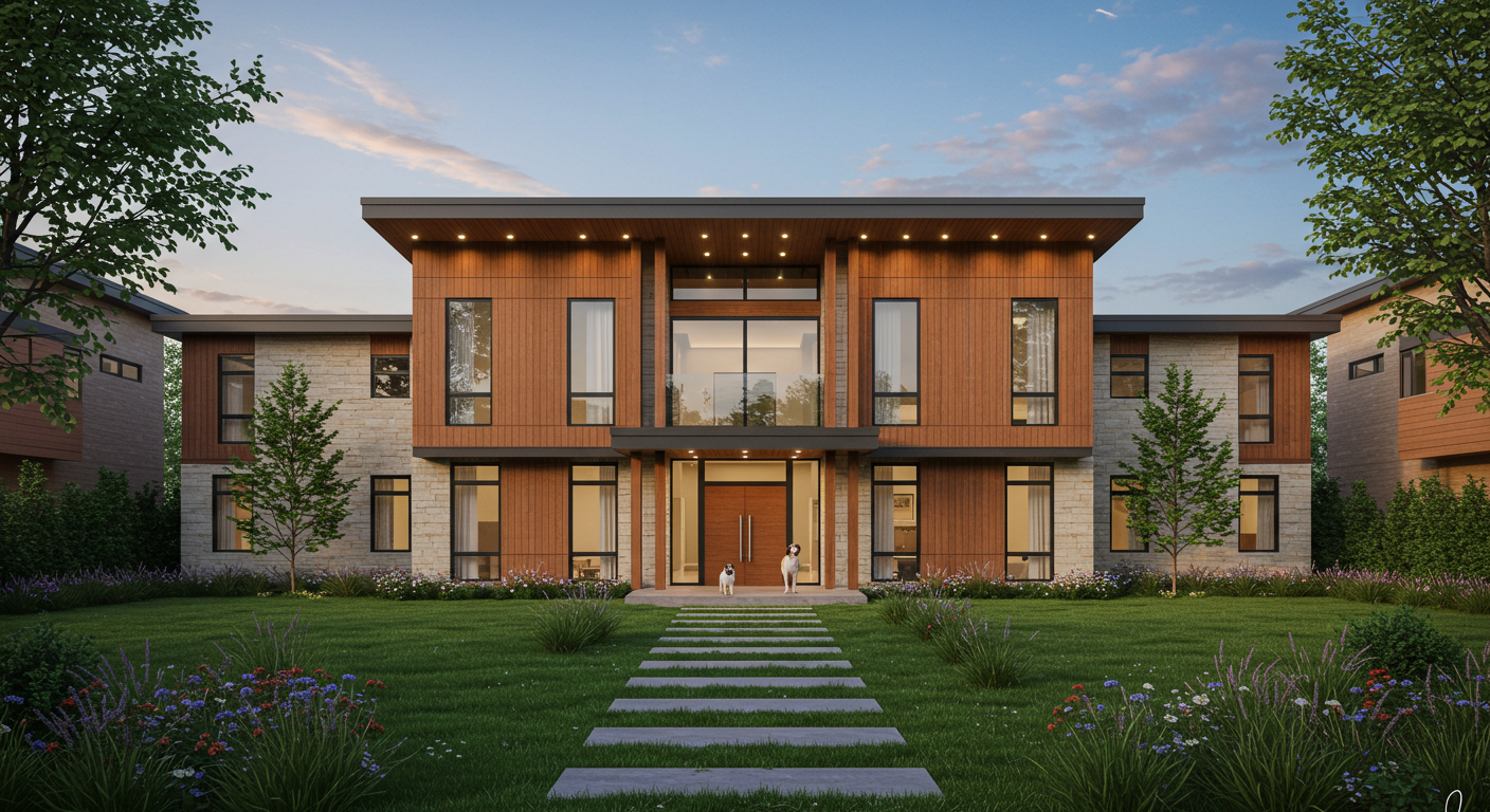 It's a large home, but it's also broken up into a series of pavilions, which gives it a more human scale. Two shed roofs frame a gabled volume, with glass panels connecting to slightly elevated roof planes.