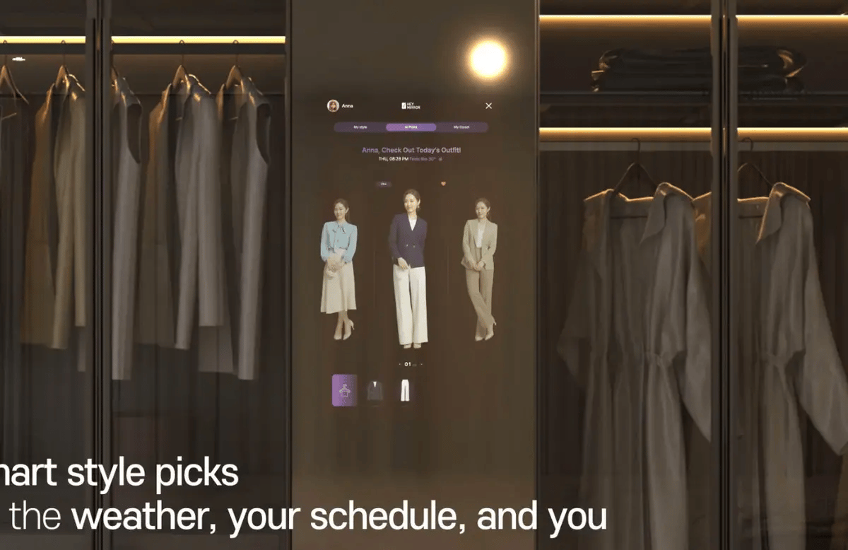 Eoneoms’ HEYMIRROR is an AI-powered smart dressing mirror that delivers personalized outfit recommendations using real-time data like weather, calendar events and the occasion. The system automatically recognizes multiple users and learns style preferences over time.
