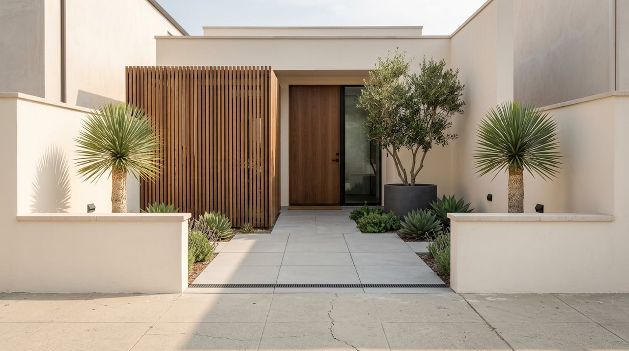 This kitchen achieves an inspiring balance of warmth and function. The dark stained concrete floor is a forgiving flooring option for a kitchen, and the rectangular rug softens the concrete’s effect while also mirroring the cutout entrance into the room. All the appliances are mounted off the counter top for maximal countertop space, and the multi-dimensional wood accent along the wall calls attention to the home’s roofline.