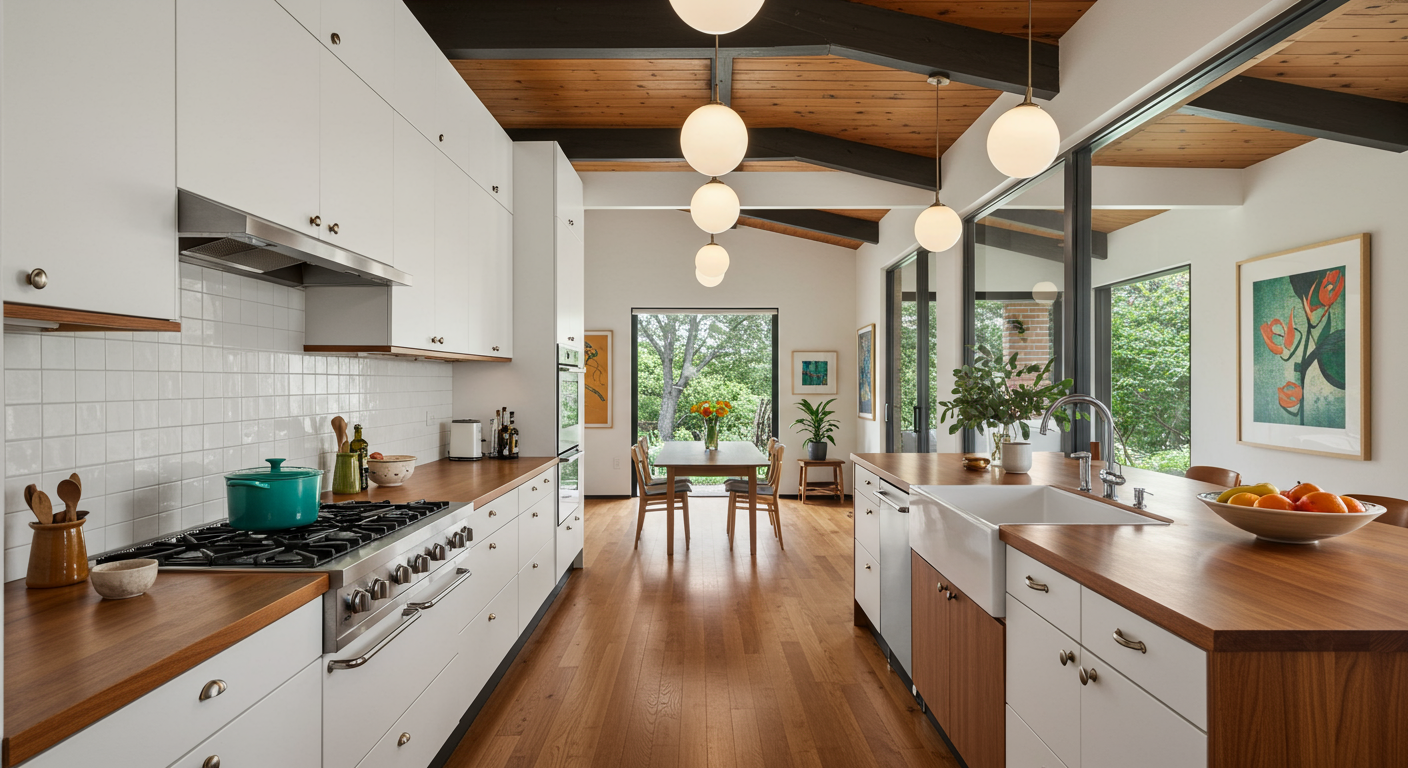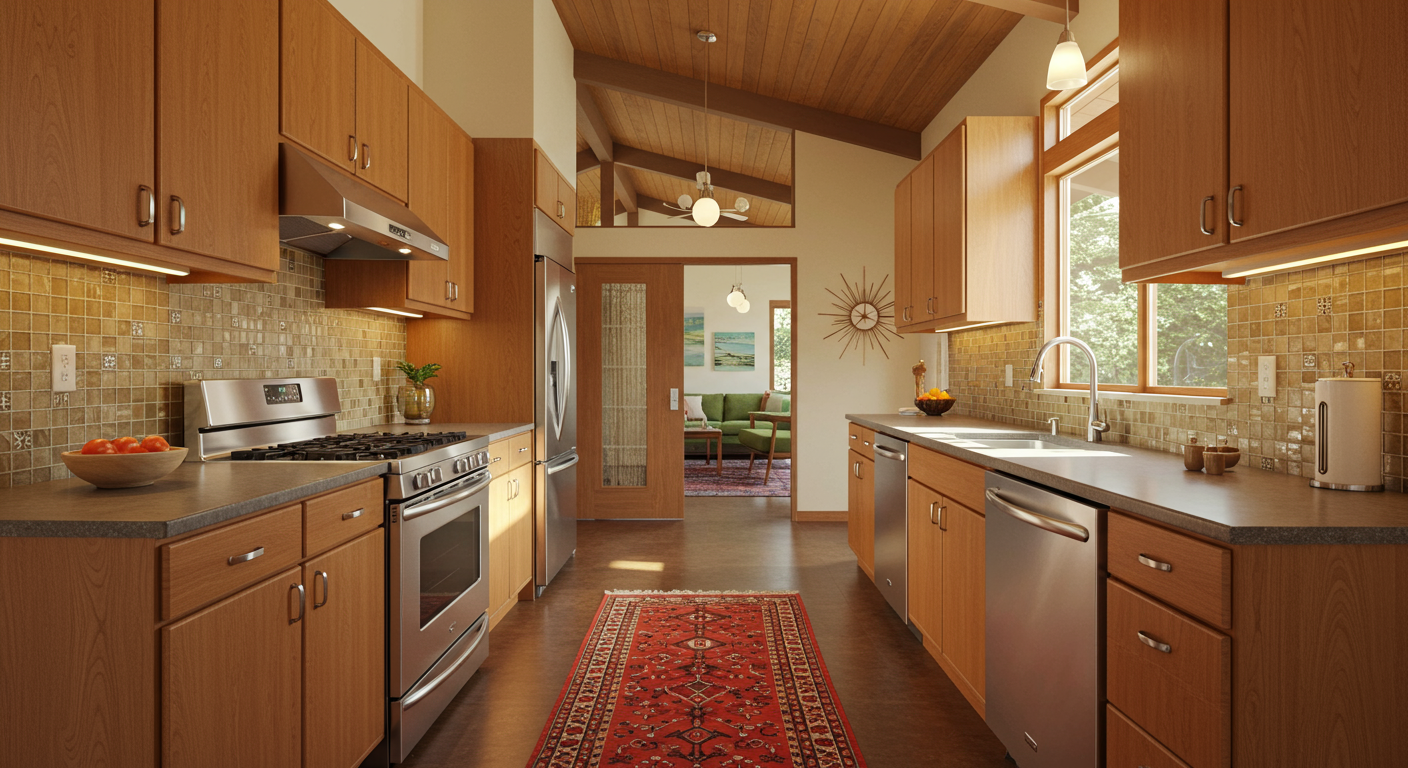 Mid Century Modern kitchens can be tight on space, so making use of every square inch of a high-traffic, high-function room of the house is especially important. Many MCM homes have a galley kitchen, a layout like the kitchen on a galley or ship, that makes use of tight quarters with a parallel design with cabinetry and countertops on each side of the long, narrow kitchen. While galley kitchens are practical, how do you design them to also make them as appealing as they are practical?