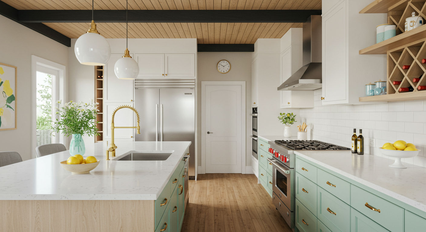 This kitchen has more ample space than a typical galley kitchen, but the heart of it is designed around a galley layout. The design balances wood, white and mint green cabinets, which harmonizes for a calming effect. The kitchen design also takes advantage of the home’s vertical storage opportunities with its high ceilings.