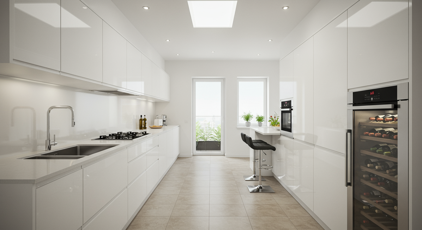 This stark white galley kitchen embodies a minimalist look with parallel walls of white cabinetry with barely there cabinet pulls. All the appliances are mounted, which leaves valuable counter space free. A skylight and view out the sliding glass door keeps the room from feeling overly stark.