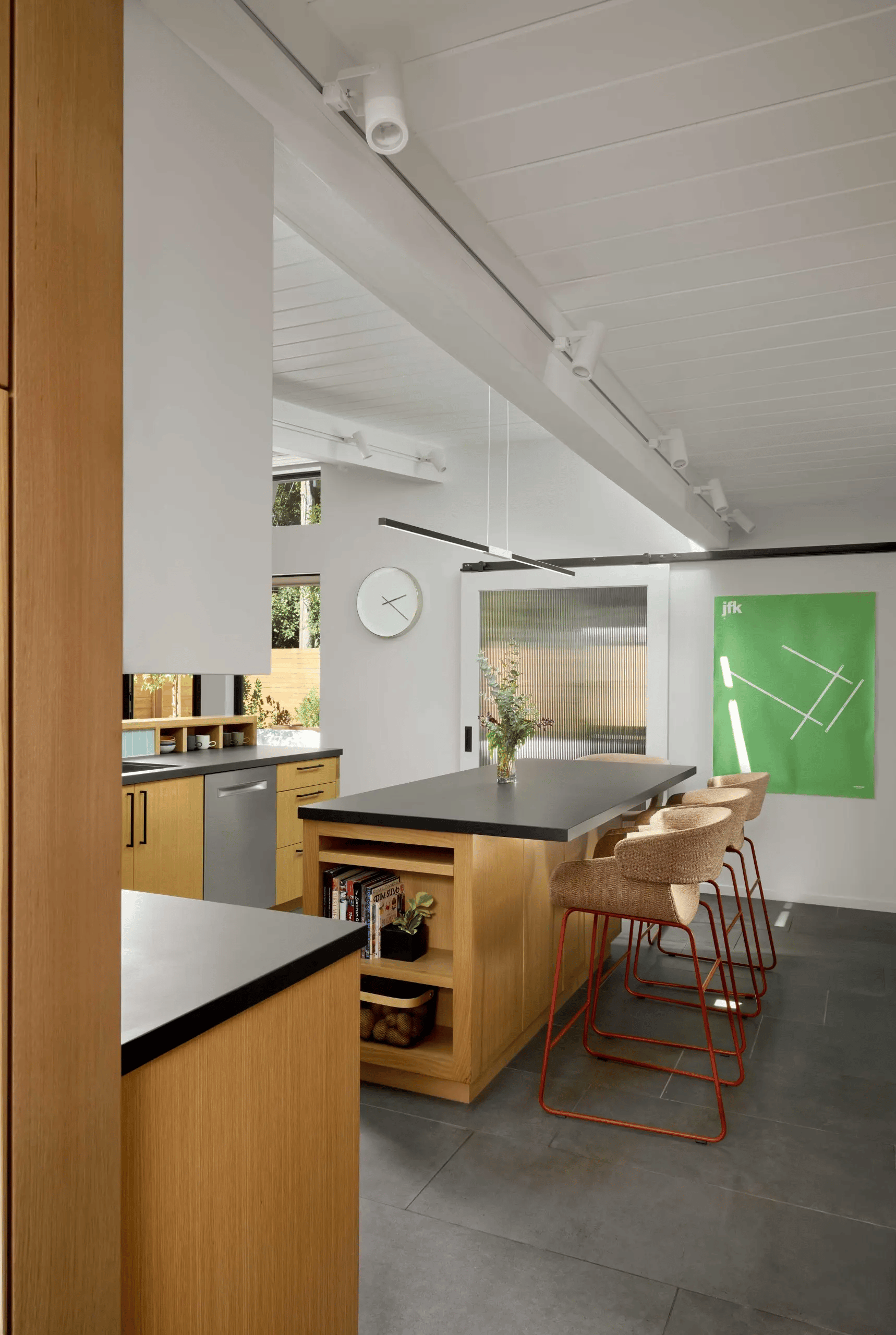 Material choices reinforce this sense of continuity. Oak cabinetry, large gray floor tiles, and bronze window frames create a calm backdrop that allows moments of color to appear throughout the house as subtle accents.