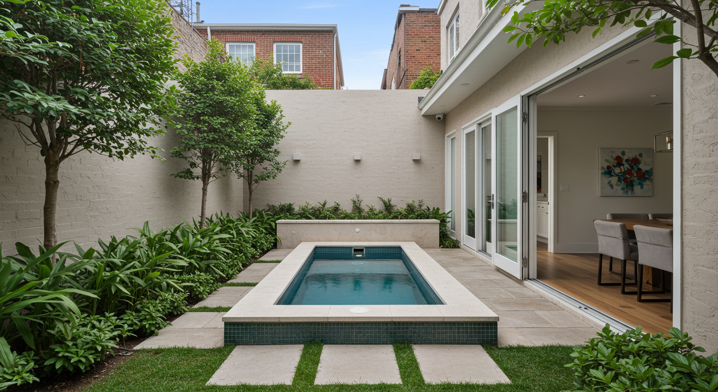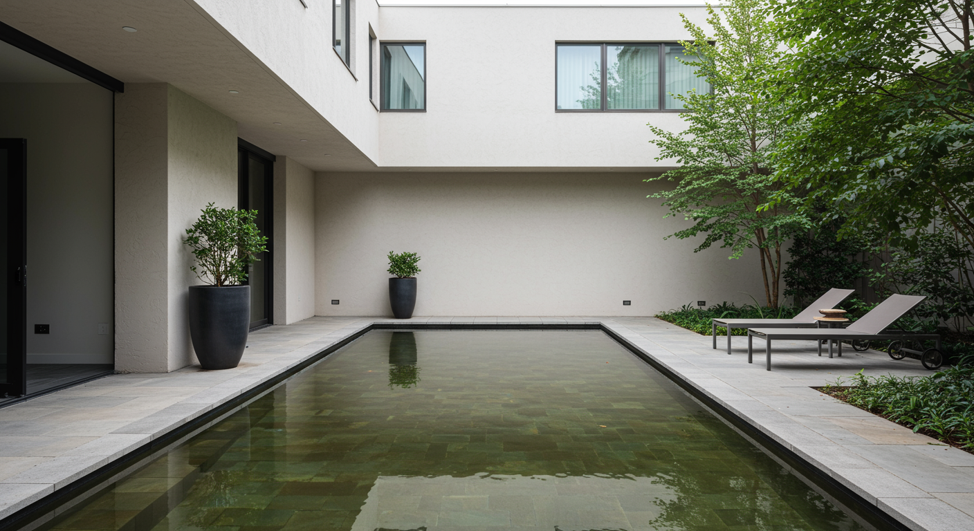 Mérida. Due to the limited dimensions of the backyard resulting from the placement of the rear room and existing structures of the house, as well as a cistern, the pool is located between both sections. To increase its surface area, the pool extends over the remains of the rear section and surrounds the cistern, creating greater contact and integration with the terrace. The cistern is repurposed as a jacuzzi. The flooded room becomes a visual focal point from the entrance, blurring the boundaries between the interior and exterior spaces and merging them together.