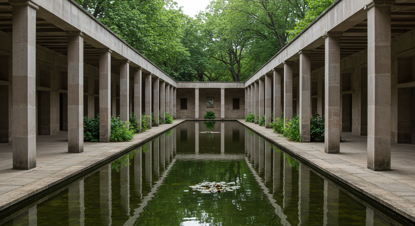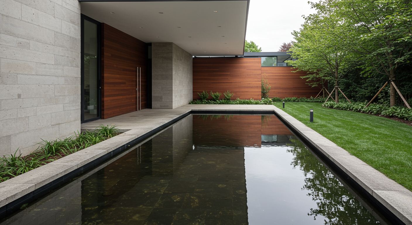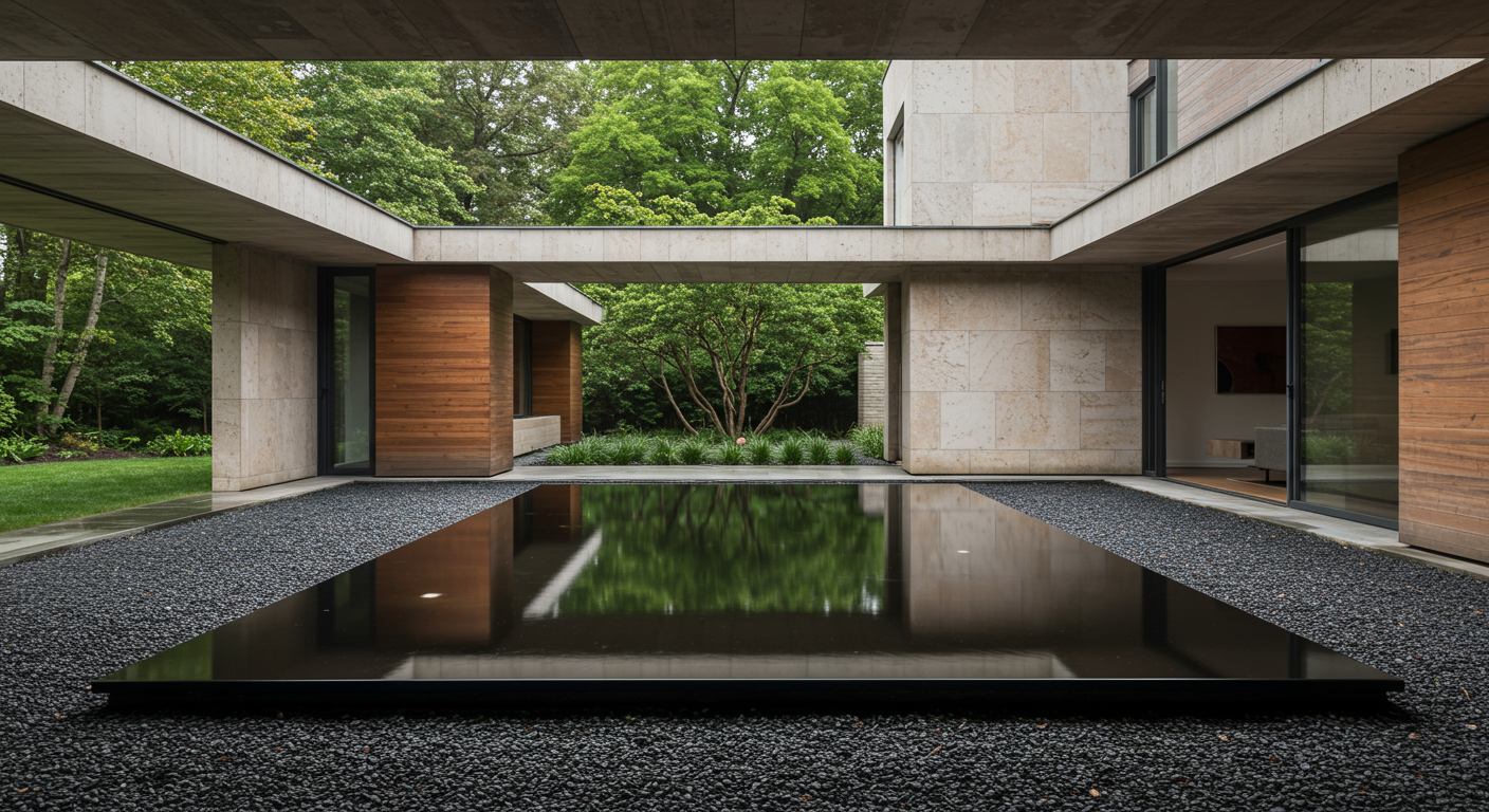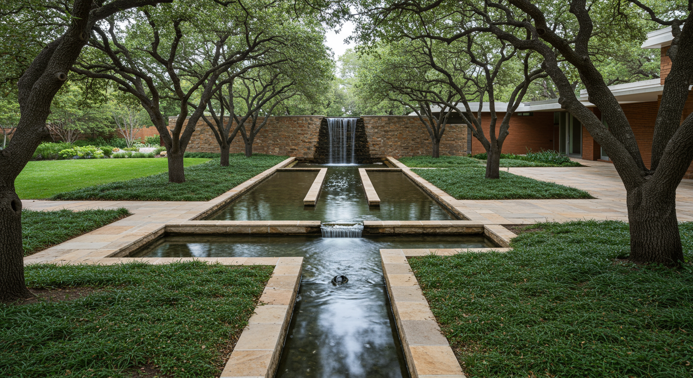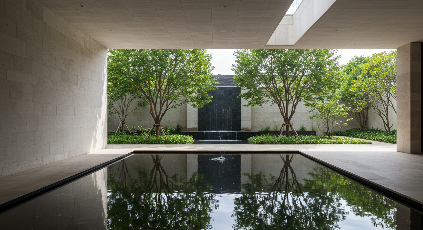 Mexico City called Bosques de las Lomas. The continuous presence of trees surrounds the space, making them perhaps our most present guests and, in any case, the most enveloping, similar to water, which flows continuously. Fountains and mirrors are constant natural elements where reflections enhance the environment, which is predominantly green in this case, as trees and vegetation are highly valued in densely populated cities, along with water, land, and even more so today, privacy.