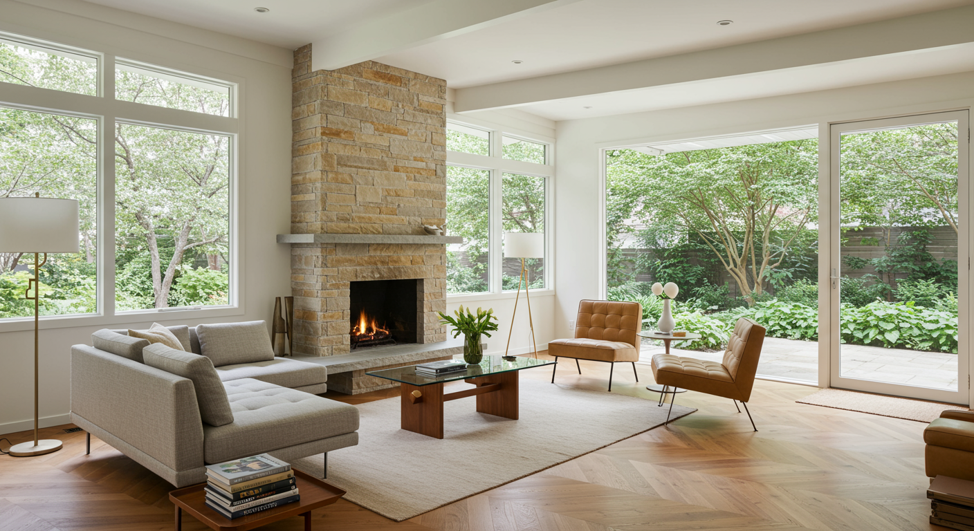George and Michael chose to embrace the neutral-toned flagstone on the fireplace—leaving the home’s massive centerpiece in its original condition.To bring the Mid Century Modern living room to life, the heavy window valances were removed, allowing natural light to filter into the space and creating a seamless transition between the house and outdoors. They added oak hardwood floors to the room and painted the walls and trim white while leaving the original flagstone fireplace in its natural beauty.