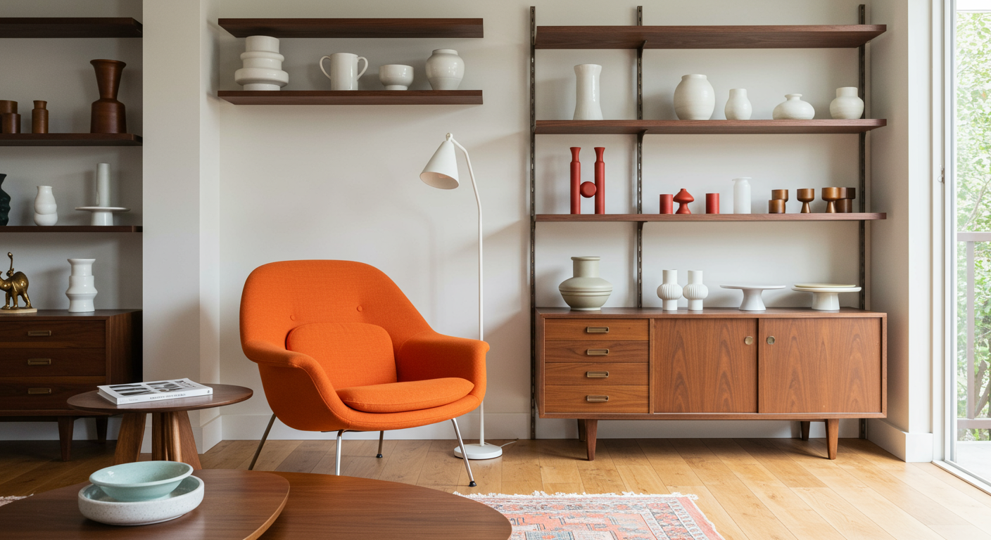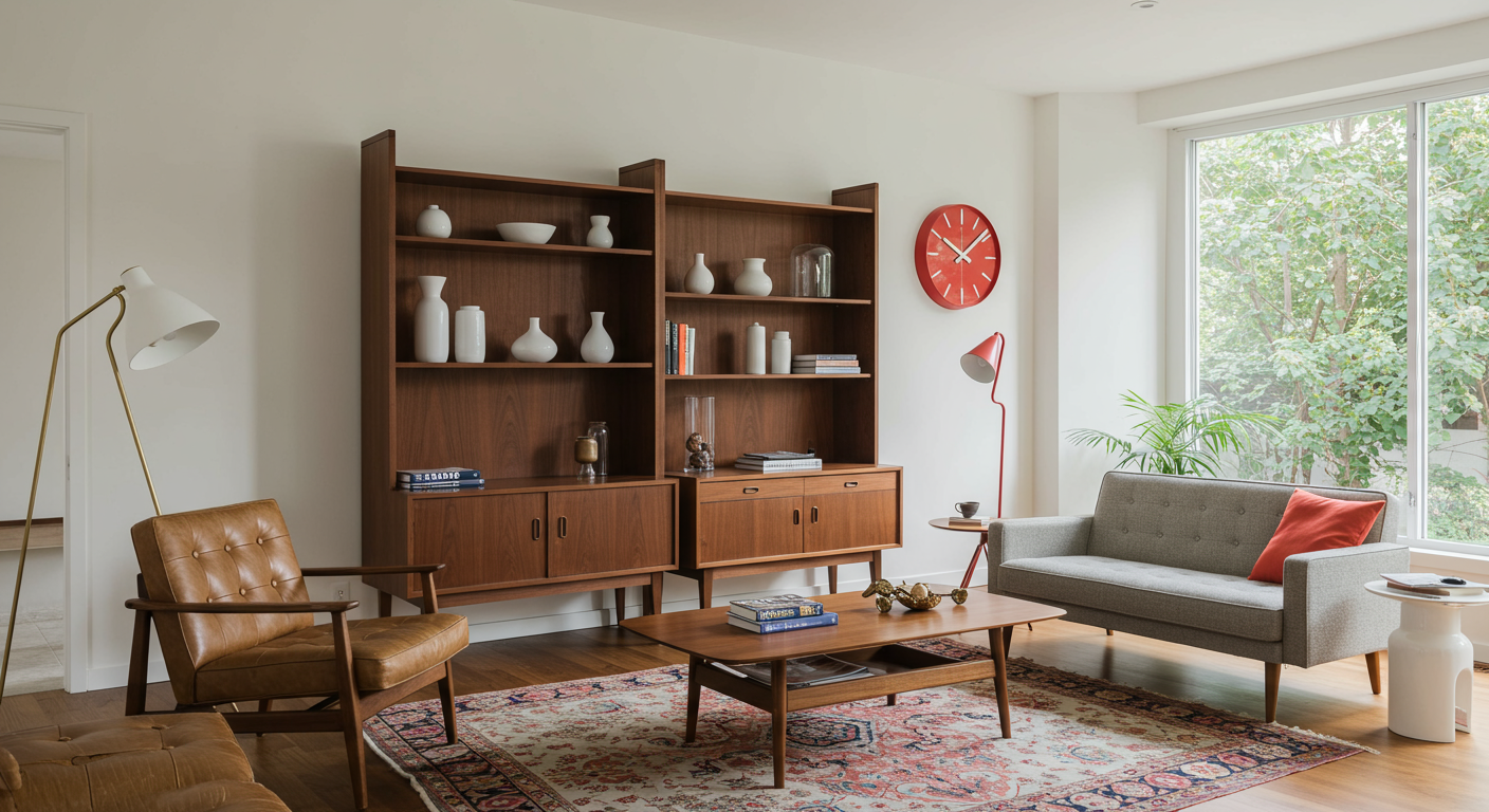 George hung a red George Nelson clock on the wall and placed white pottery on the bookshelf, citing his love for the look of white pottery against the walnut. He also mixed in the vintage pieces, such as Bitossi ceramics, and books that he had collected over the years.