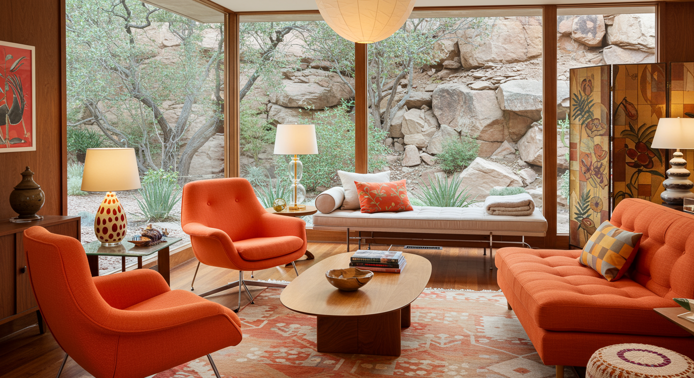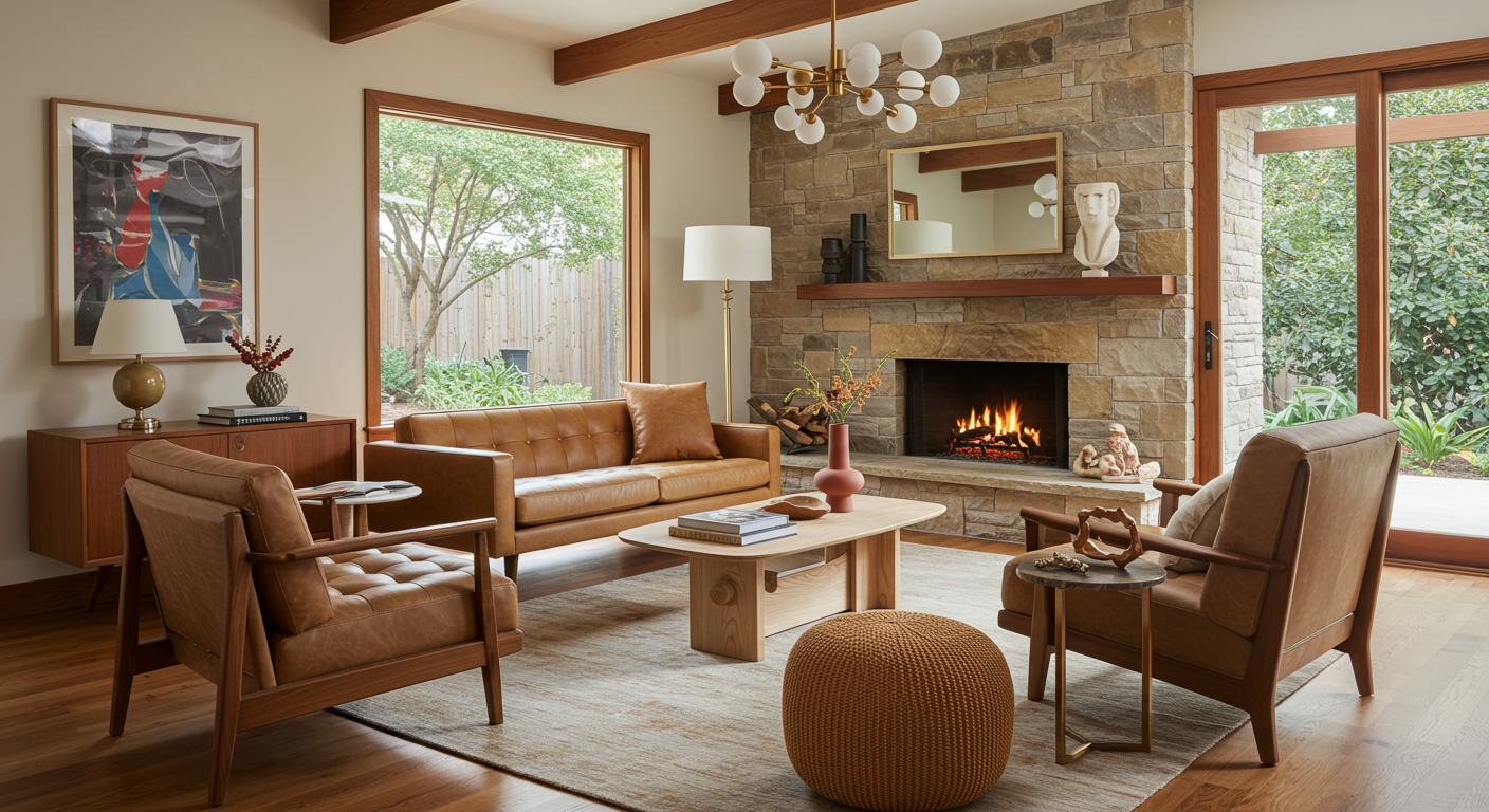 The variety of seating options in the house den gives the mid century living room a playful and welcoming personality.