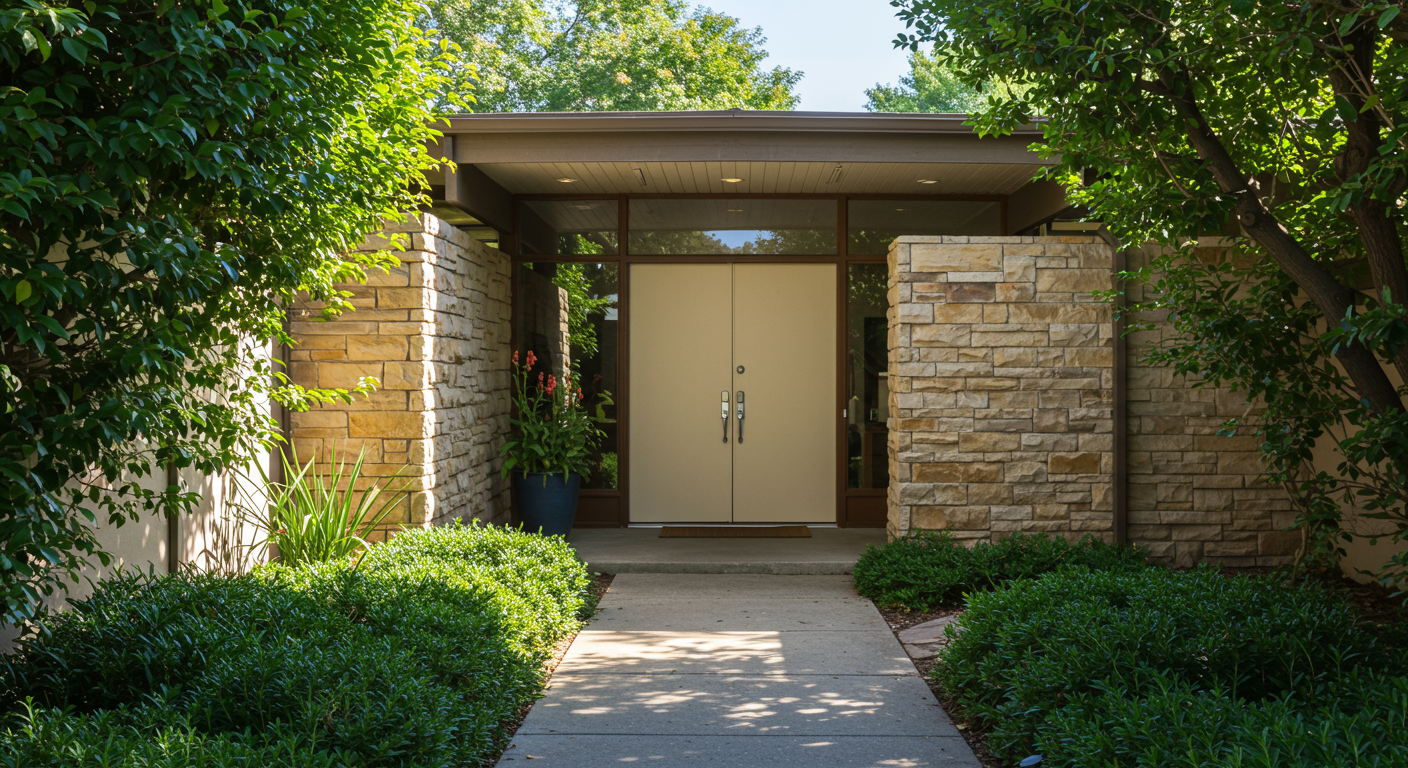 The front entrance has warm stone and wide double doors to welcome guests into the home.