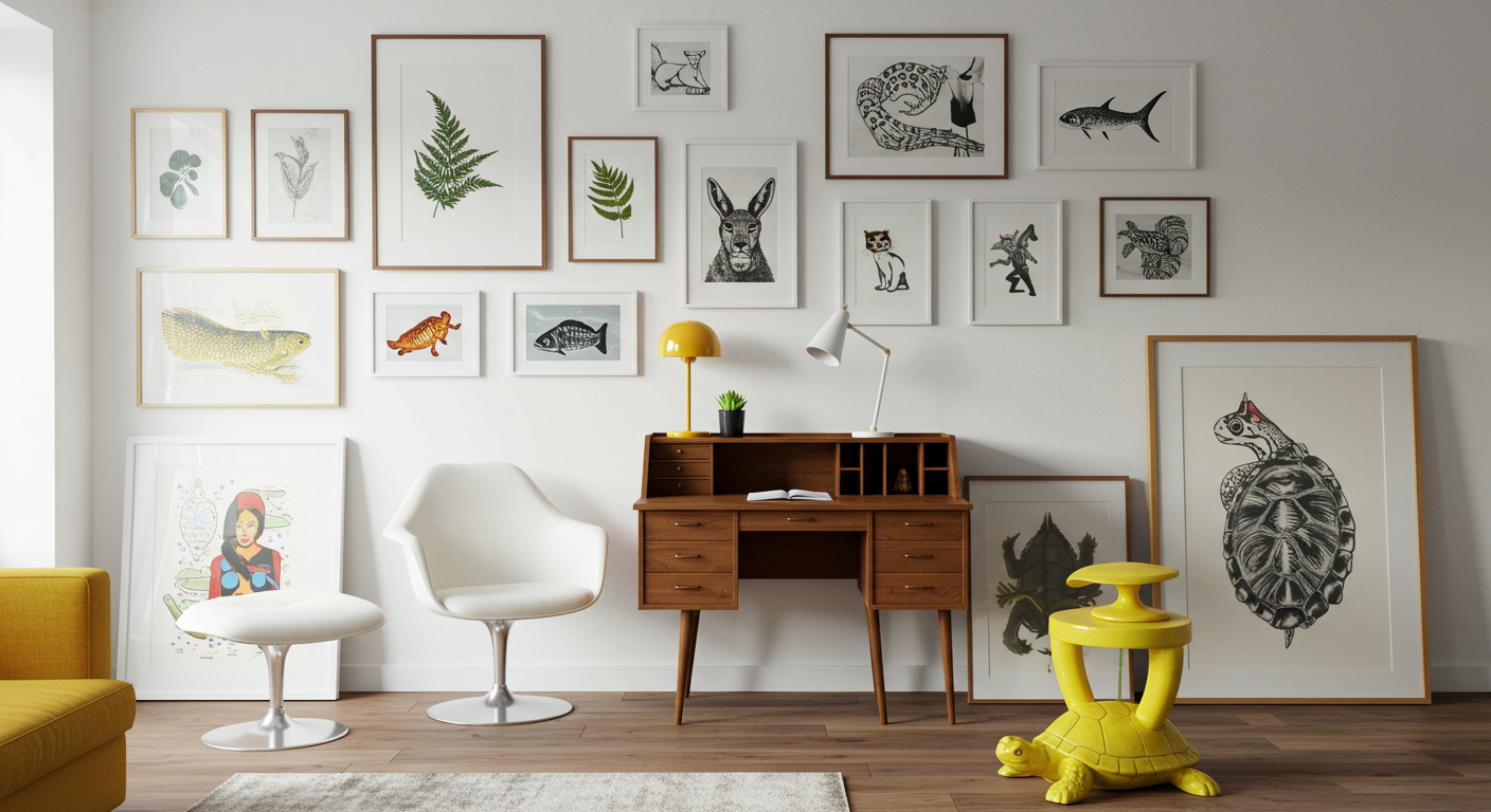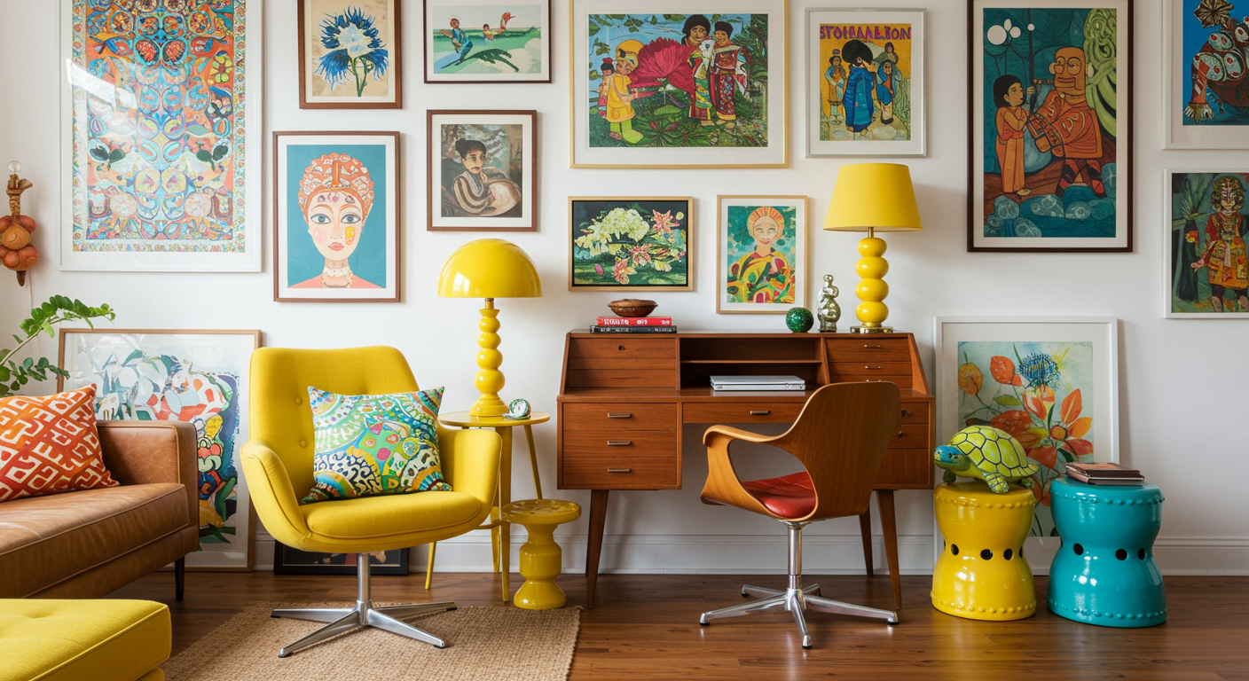 George and Michael carefully curated a mix of modern and vintage art pieces for their mid century home. Each one chosen to match their home and personalities. The vintage mid century style gives the white wall a funky personality.