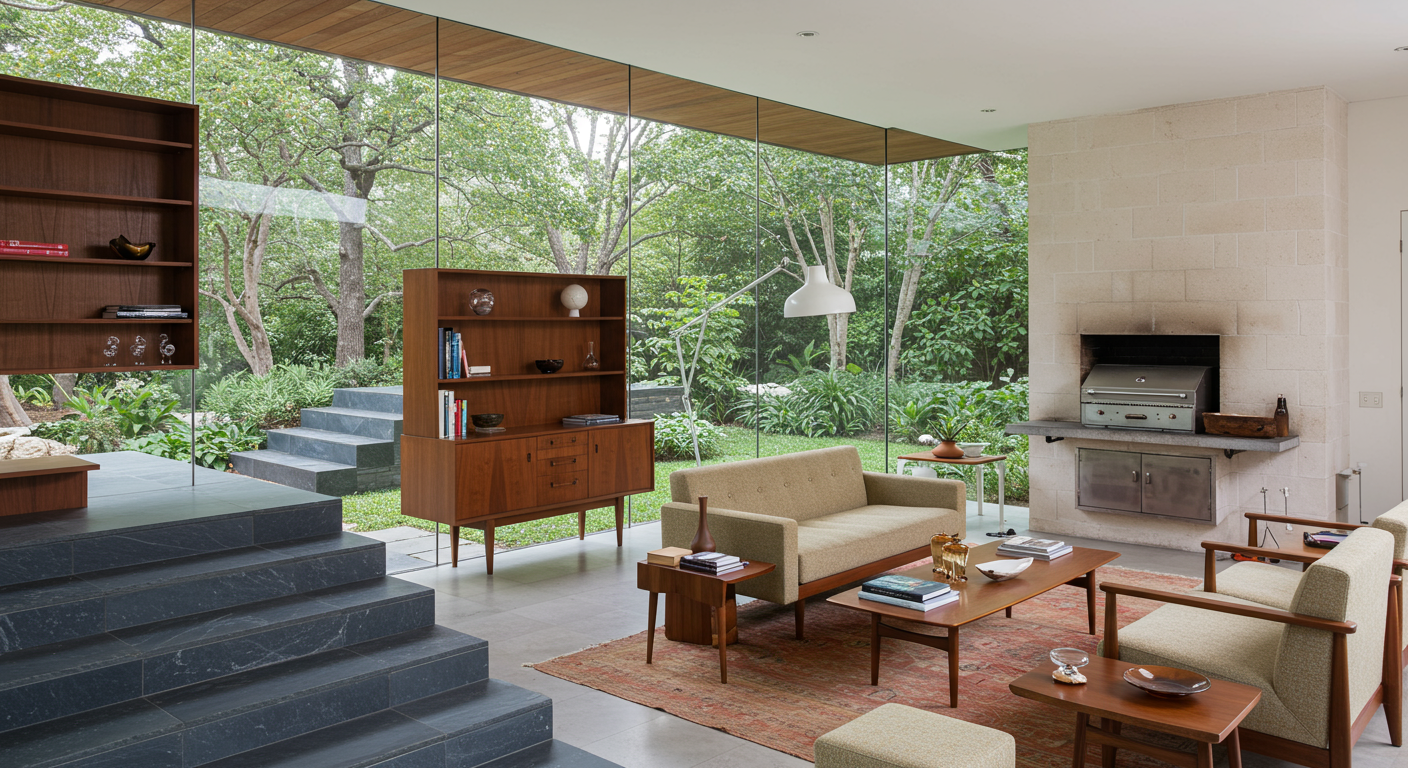 For the glass-walled den, George and Michael left the slate stairs that brought guests around to the other side of the fireplace. The den features the house’s original walnut bookcase, working indoor grill and lighting fixtures. In lieu of making major renovations to the space, the couple opted for cosmetic changes instead to enhance the home’s Mid Century Modern look.
