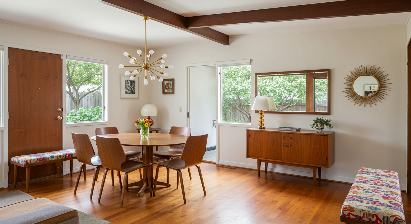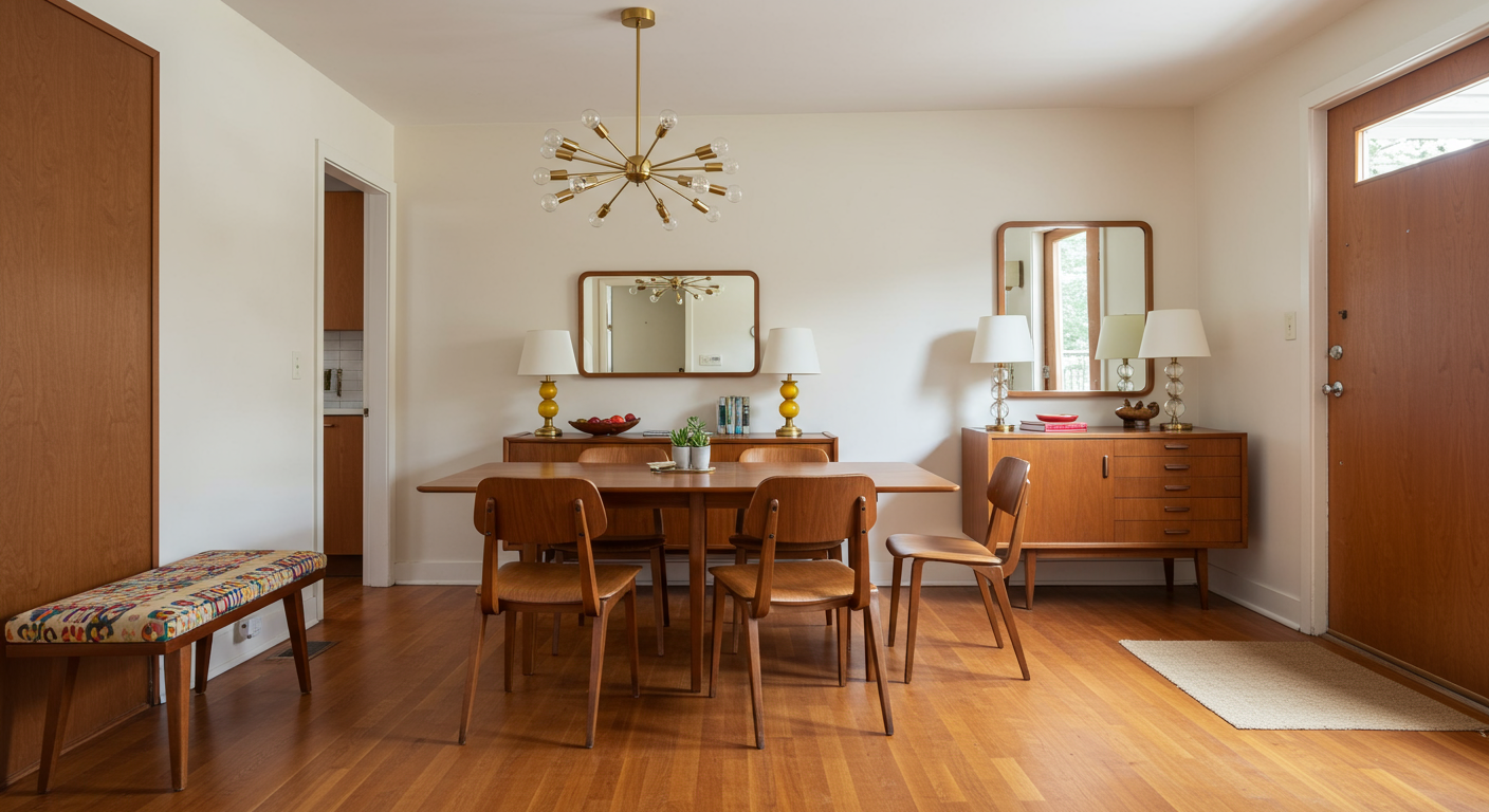 Sunken below the entryway, the dining room welcomes guests with an eye-catching vintage sputnik chandelier. Featuring the original buffet and mirror, George accented the oak floors with an eclectic mix of vintage walnut, including Cherner end chairs. The Widdicomb bench in the foyer above offers a stunning dose of color to the warm space.