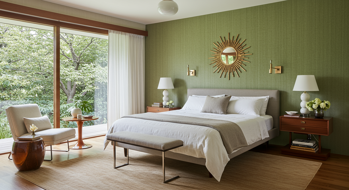Grasscloth wallpaper in the master bedroom adds texture. It creates a calm retreat that takes full advantage of the large windows overlooking the property. Paul McCobb end tables and a Jonathan Adler starburst mirror bring a modern vibe to the space.