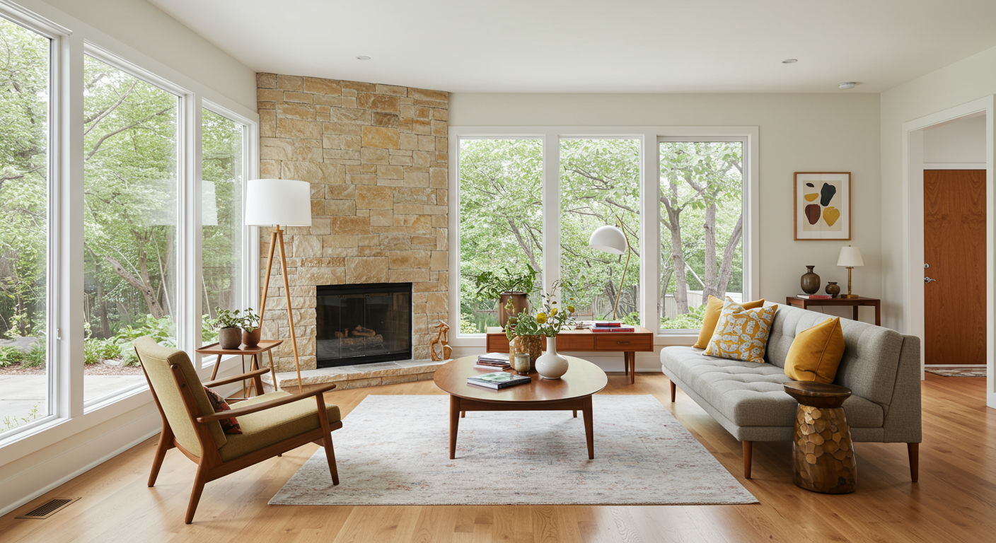 George and Michael both favor the refreshing look of natural light. So, naturally, they wanted as many windows as possible to lighten the mid century living space.