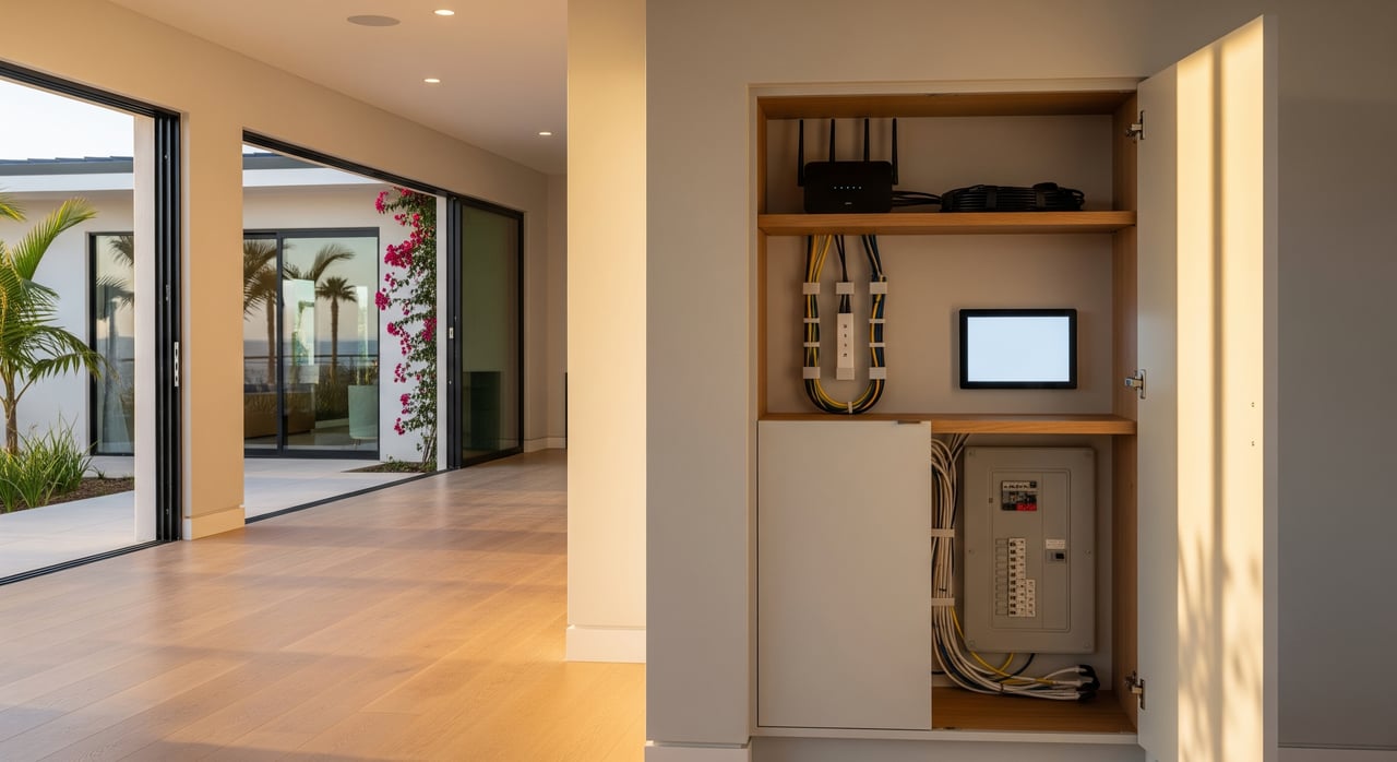 They stripped the home’s numerous wall treatments and flooring materials and clad the entire interior in custom-colored red oak wall paneling and a creamy white terrazzo floor, eliminating the stiff transitions between spaces. To better suit Gardner’s desire to entertain, Davis’s team opened up the kitchen and replaced the exterior back wall with floor-to-ceiling windows and doors, flooding the home with natural light and establishing multiple access points for effortless indoor-outdoor living.