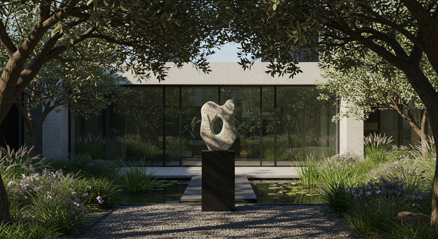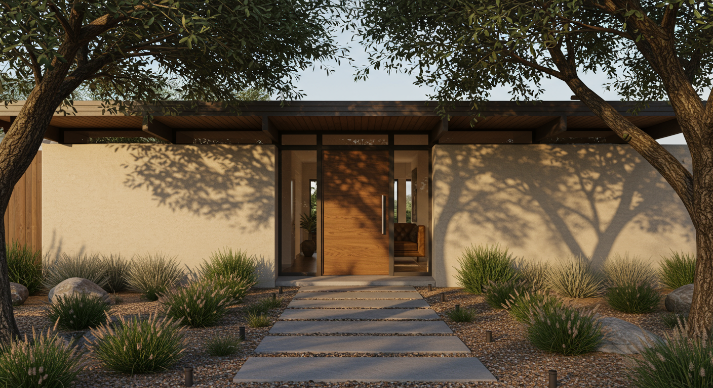 Upon entering, you’re welcomed into a charming courtyard, filled with native plants and trees. It’s like stepping into a peaceful oasis, a perfect introduction to the calm and simplicity that defines the home.