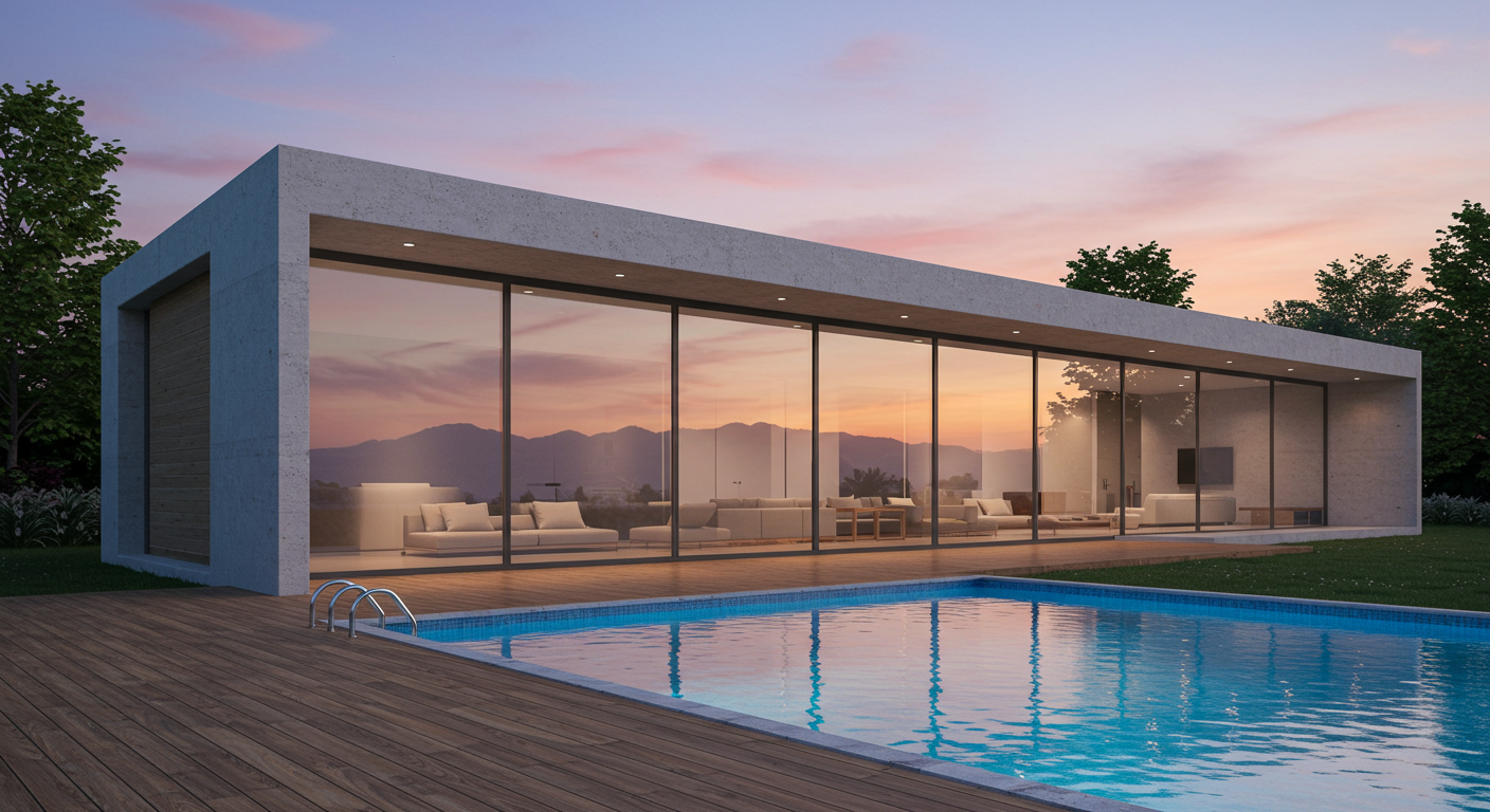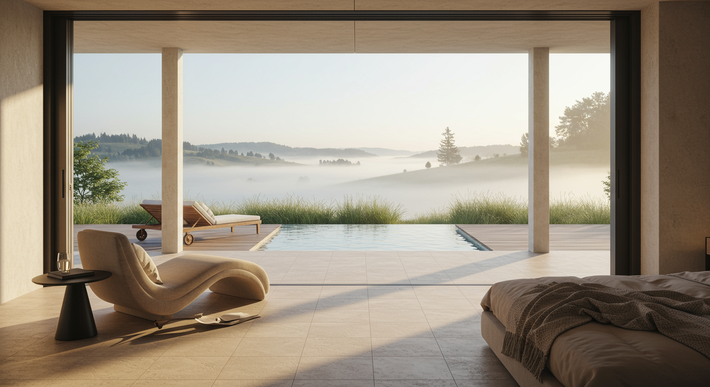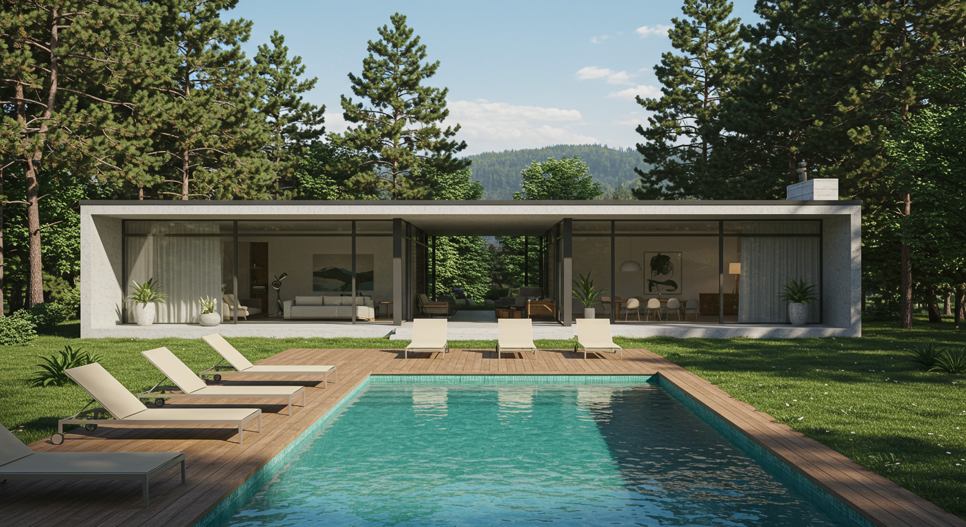 A big part of this transformation was reimagining the landscape. By moving the pool and shaping the land around it, they created more space for decks and terraces. These outdoor areas are connected to the main rooms through sliding glass doors, blending the indoors with the scenery.