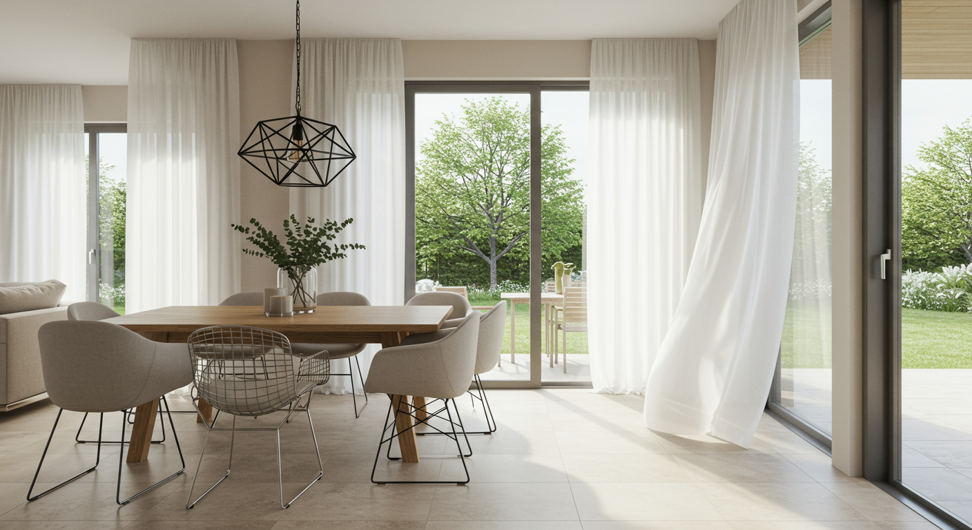 The design is simple yet sophisticated, using only four materials: aluminum, plaster, travertine, and teak. This simplicity creates a serene atmosphere that flows through the entire home.
