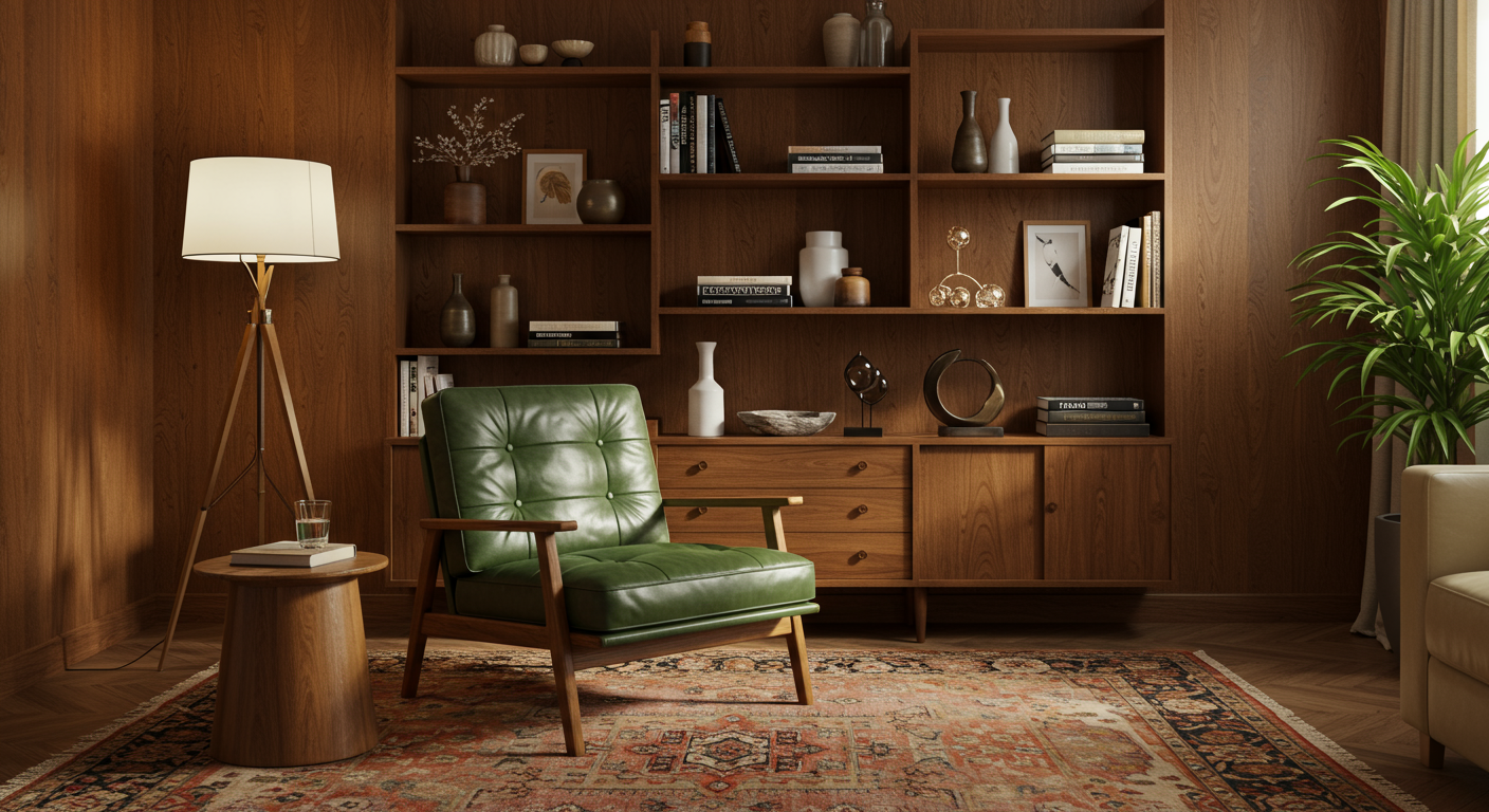 The interior is a cozy mix of new and vintage, with furnishings in natural materials and warm colors. These pieces sit alongside the owner’s personal collection of art and decor.