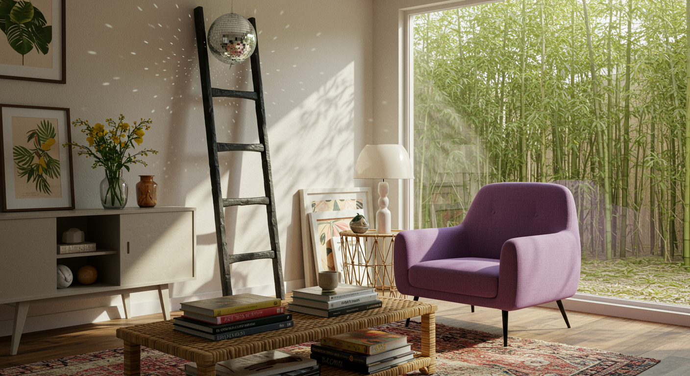 Meanwhile, in the den, a purple armchair is positioned beside a giant chair that Chinlund used as a prop for a shoot by Italian fashion outfit Roberto Cavalli.