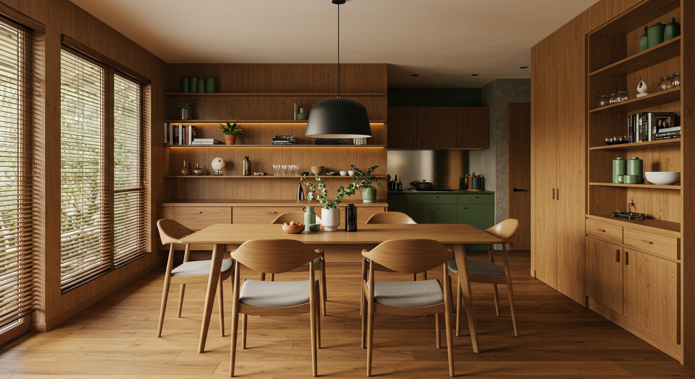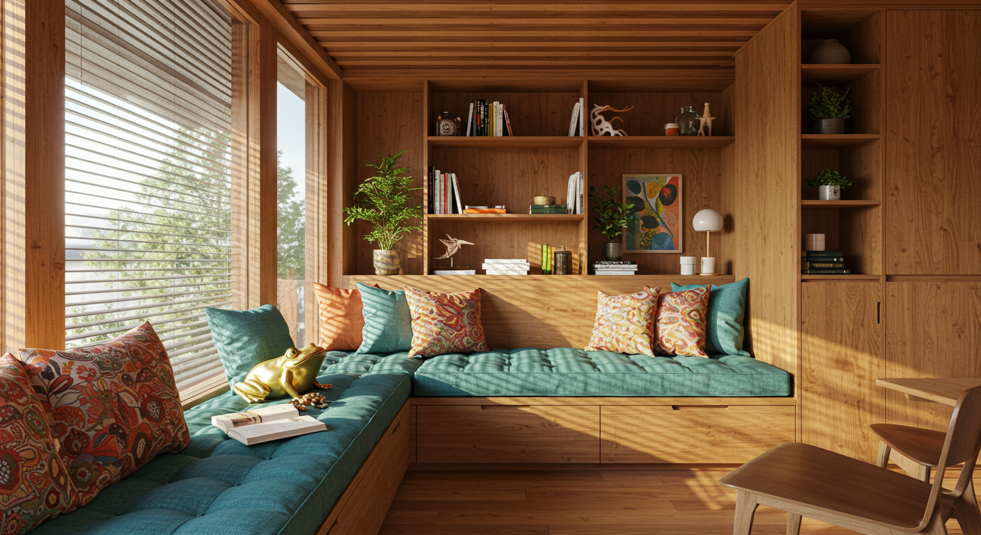 Elsewhere, colourful furnishings, collectible design pieces and bold artworks stand out against the predominantly wood interiors.