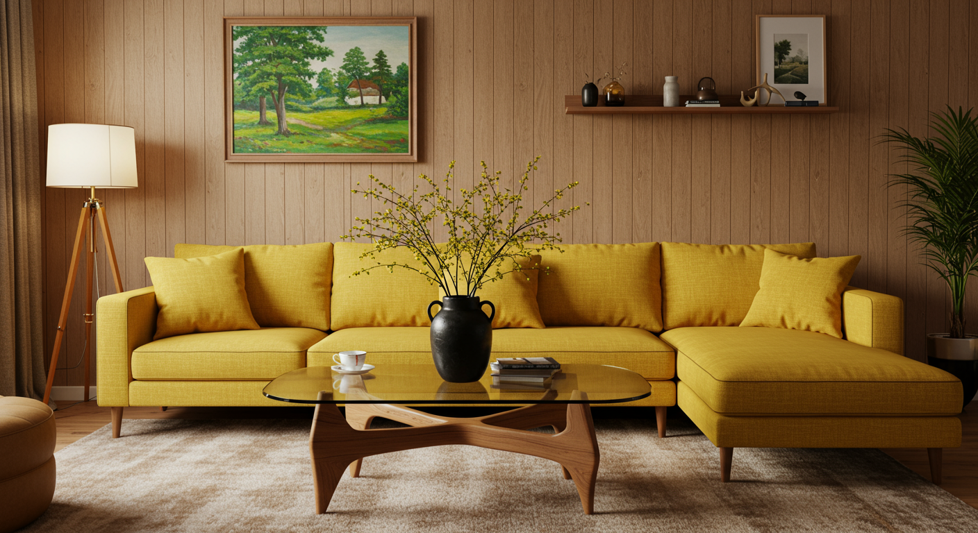 A timber-lined lounge area features the classic modular Togo sofa system by Michael Ducaroy, which is wrapped in yellow corduroy fabric.