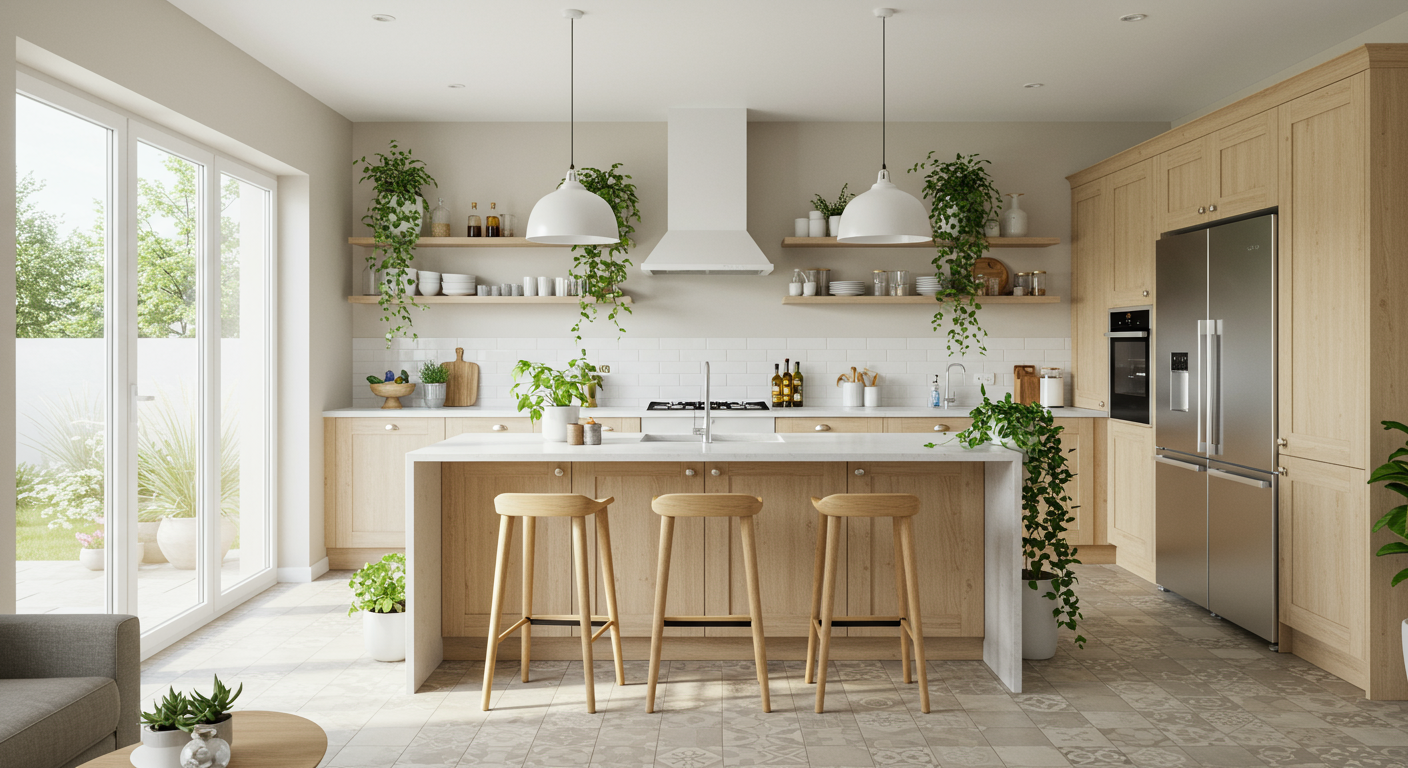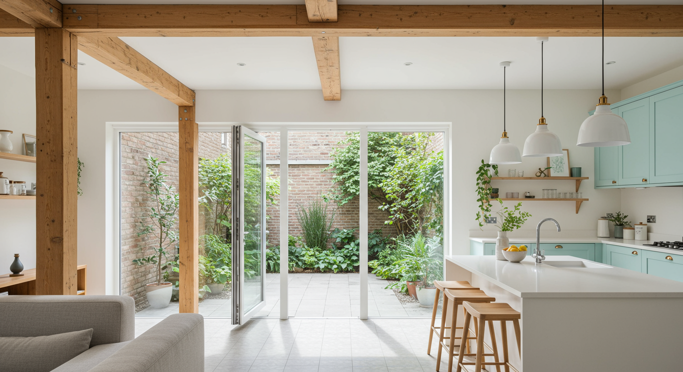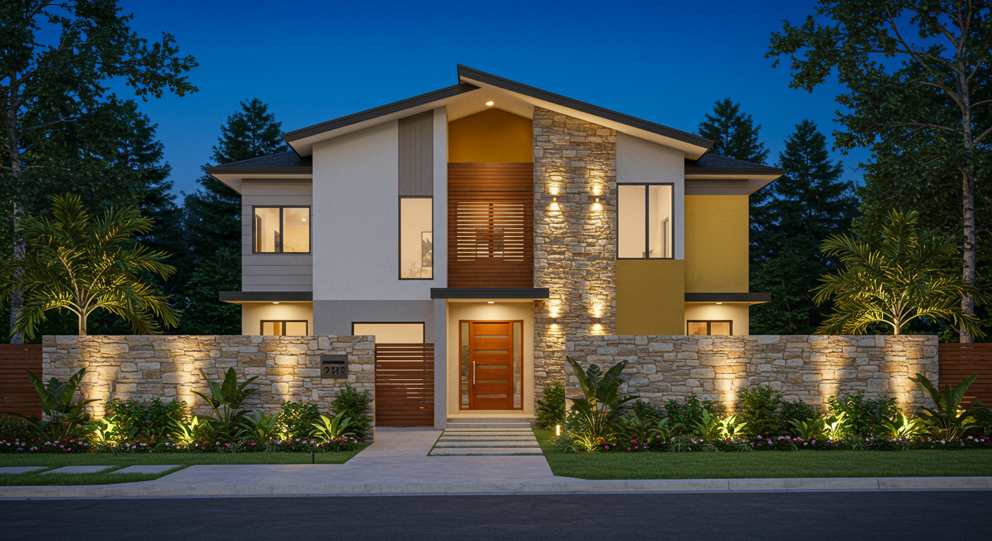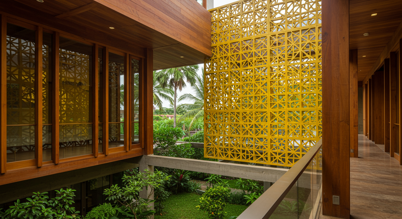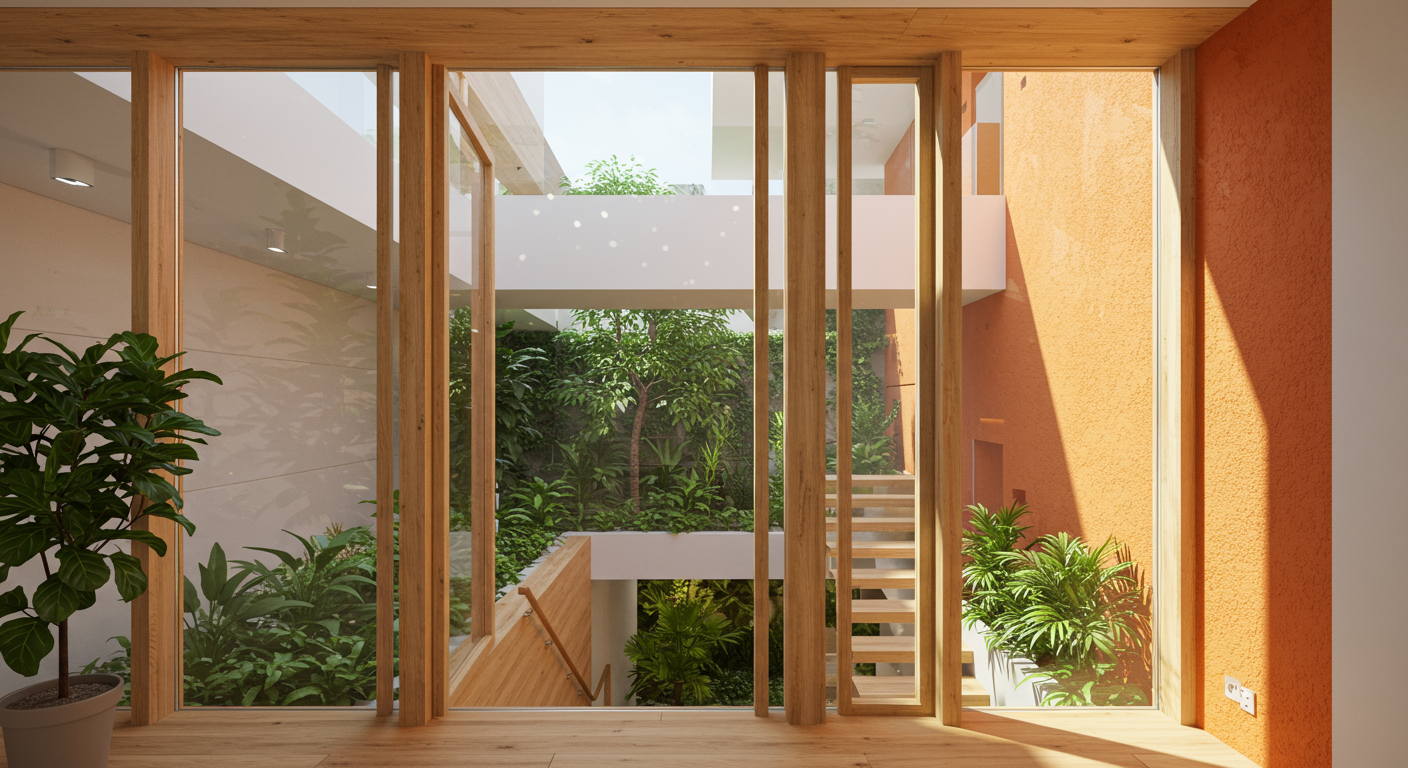 The ground floor welcomes visitors through a side entrance leading to a garden courtyard that spans the house’s entire width. Adjacent to this garden, another courtyard is highlighted by a double-height ceiling and tile flooring that integrates seamlessly with the kitchen. This arrangement maximizes space use and enhances the home’s connectivity and openness.
