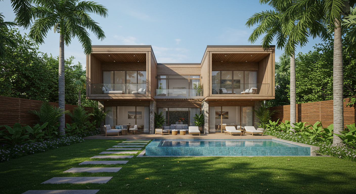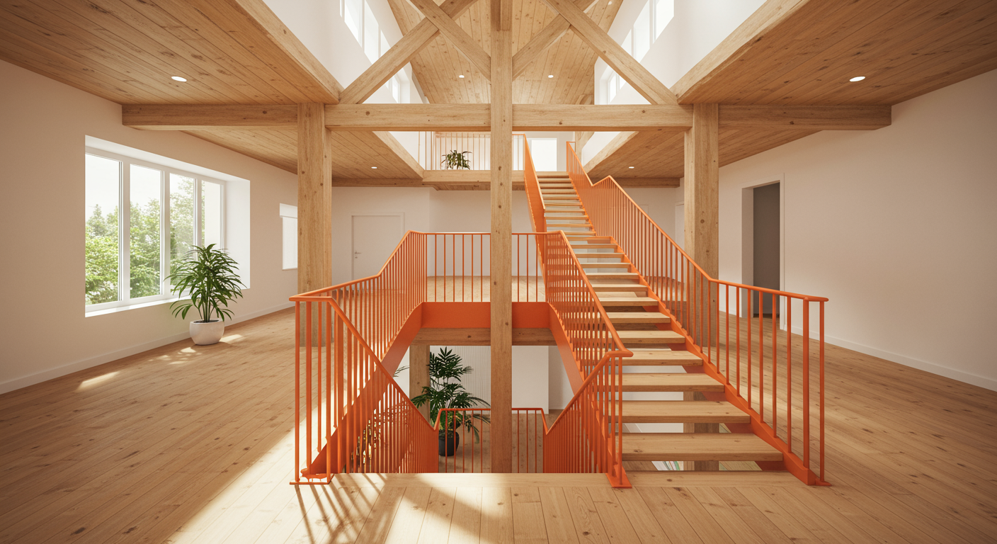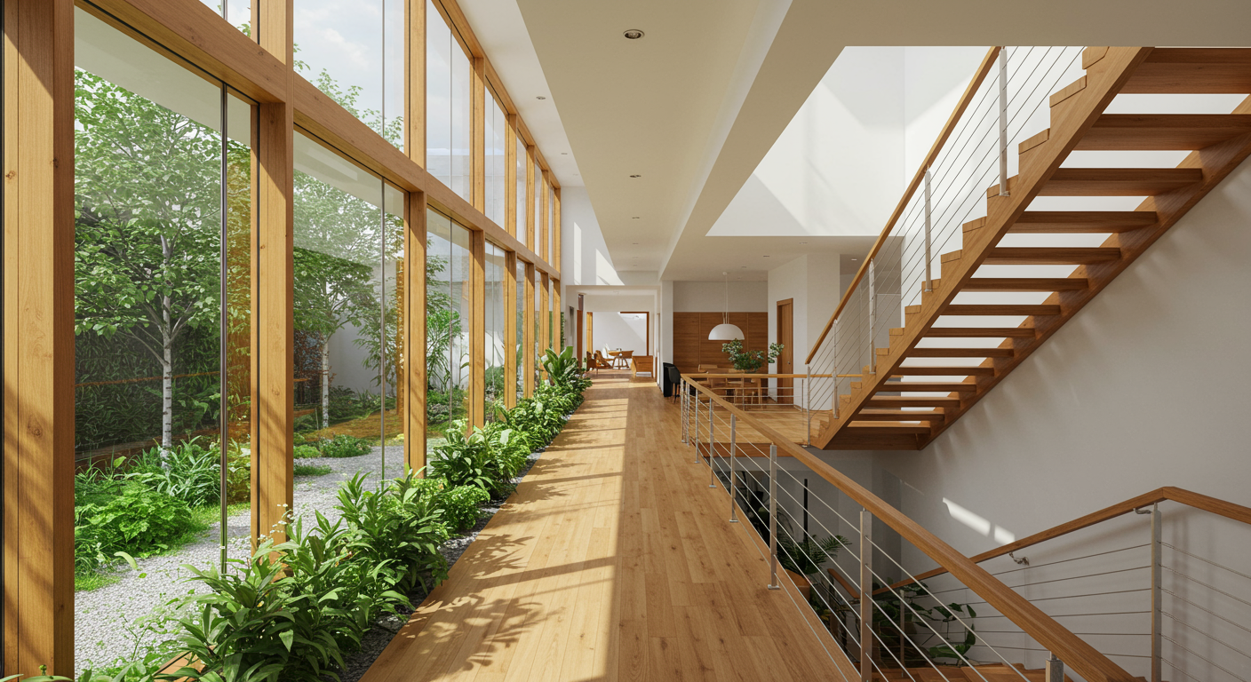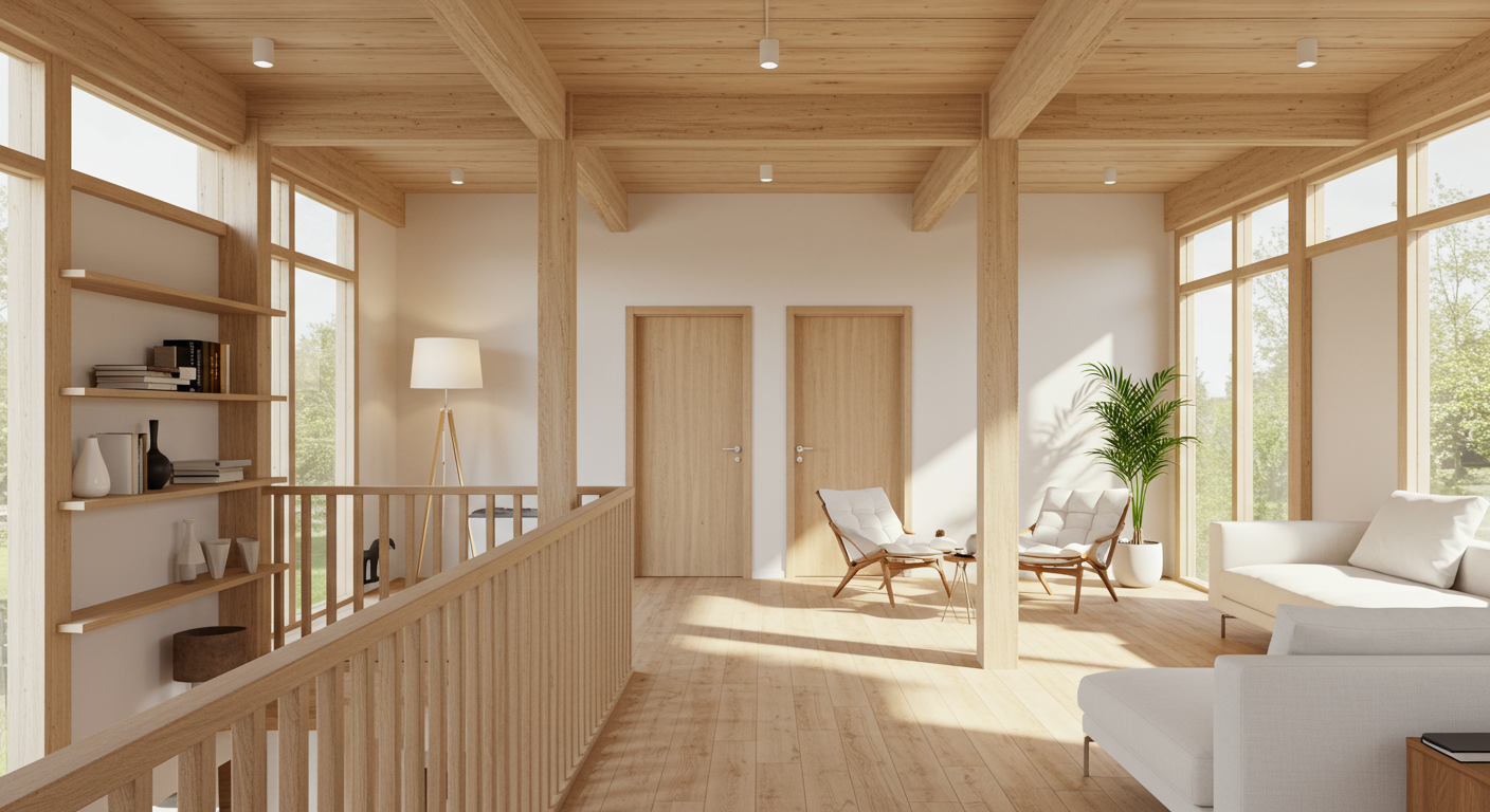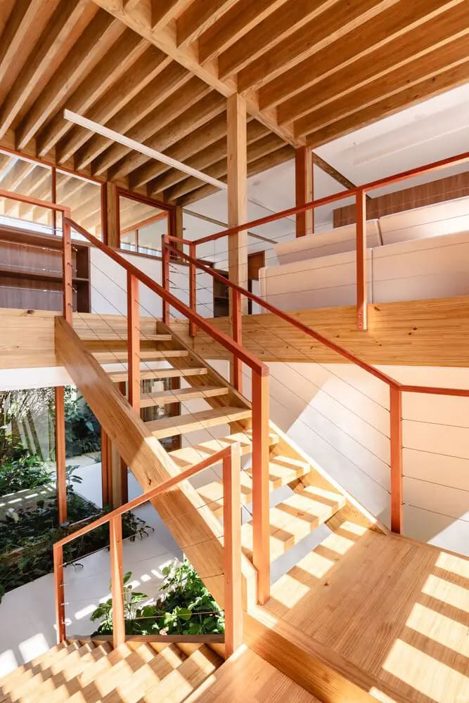 The house features three wooden floors, made entirely of glued laminated wood from reforestation projects, with the ground floor supported by a suspended concrete slab and the upper floors and central roof structured by “wall panel” slabs on wooden beams. This innovative construction method ensures stability and durability while maintaining an eco-friendly footprint.