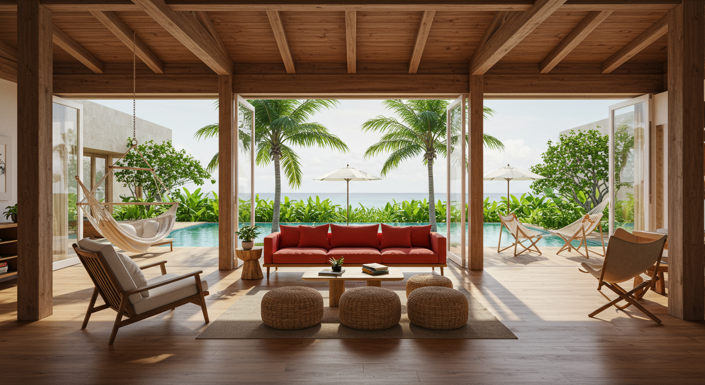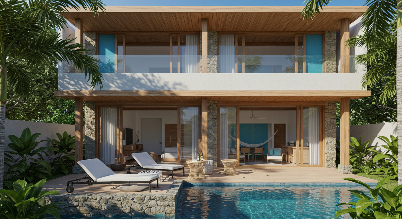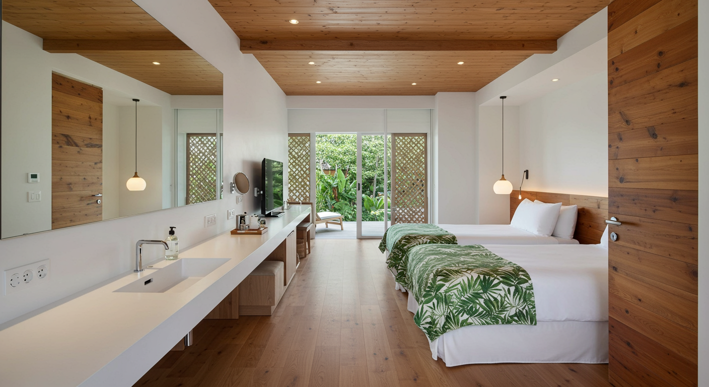 The property is relatively narrow, with a 14-meter frontage. Local regulations permit construction on only two-thirds of this width, resulting in a house just over nine meters wide. This presented a challenge: fitting three comfortable sea-view suites within this restricted space. The solution involved designing narrow but elongated rooms, ensuring each suite offers both comfort and a direct view of the sea. Ingeniously, the bathrooms feature windows to the bedrooms, allowing residents to enjoy the sea view even while showering.
