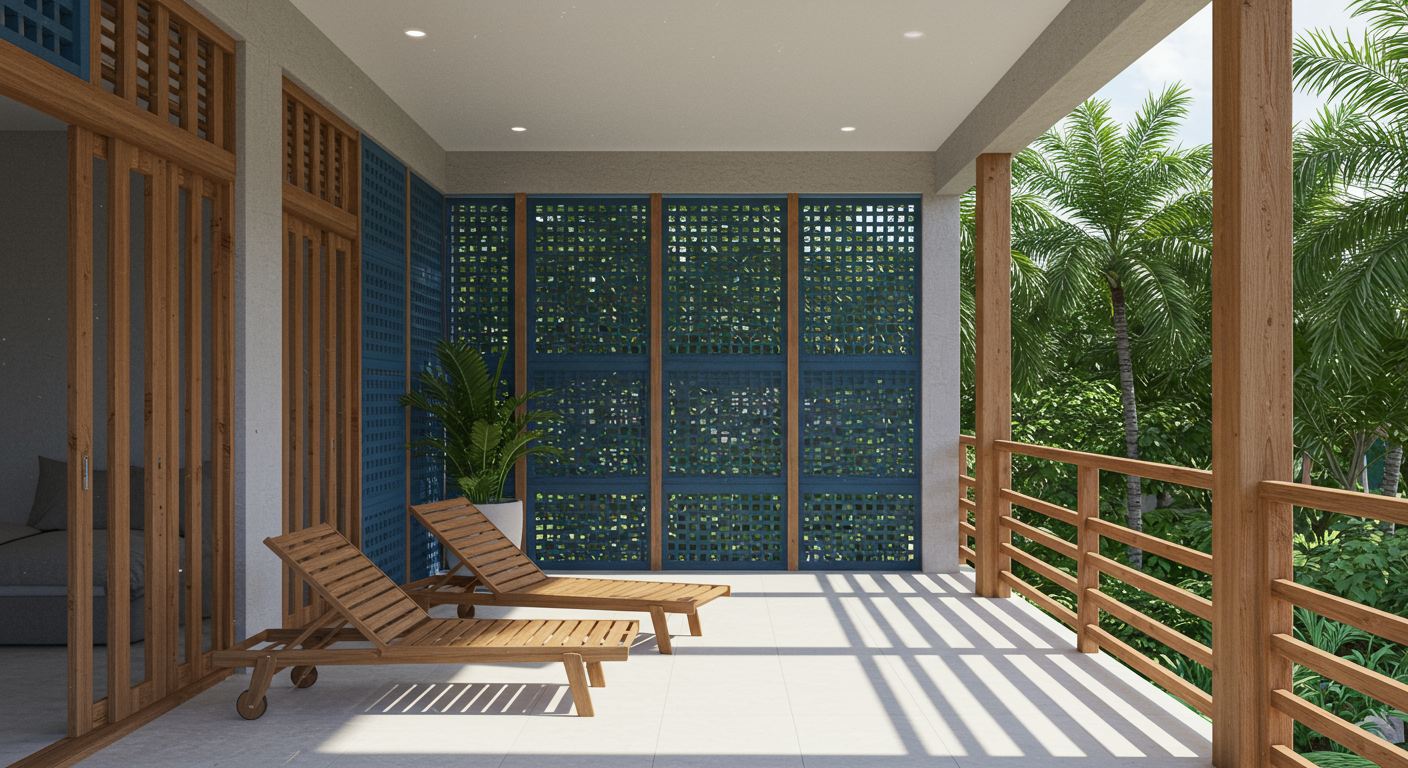 The southern façade opens up completely to the stunning sea view, allowing the natural beauty of the coastline to permeate the living spaces. In contrast, the western façade is more enclosed, constructed with cellular concrete masonry. This side includes a staircase module shielded by vertical brises, filtering the setting sun’s light and softly illuminating the internal courtyard.