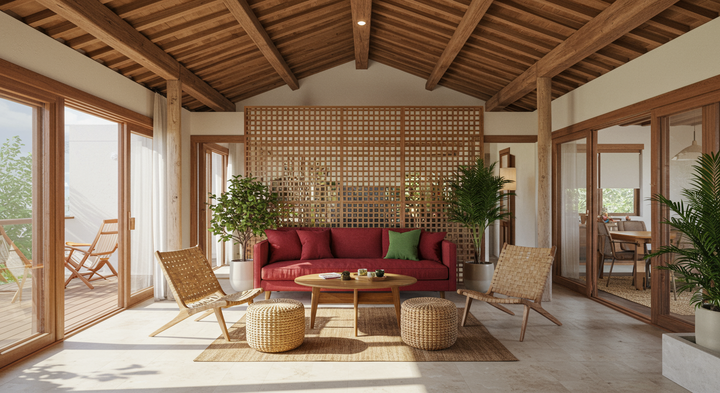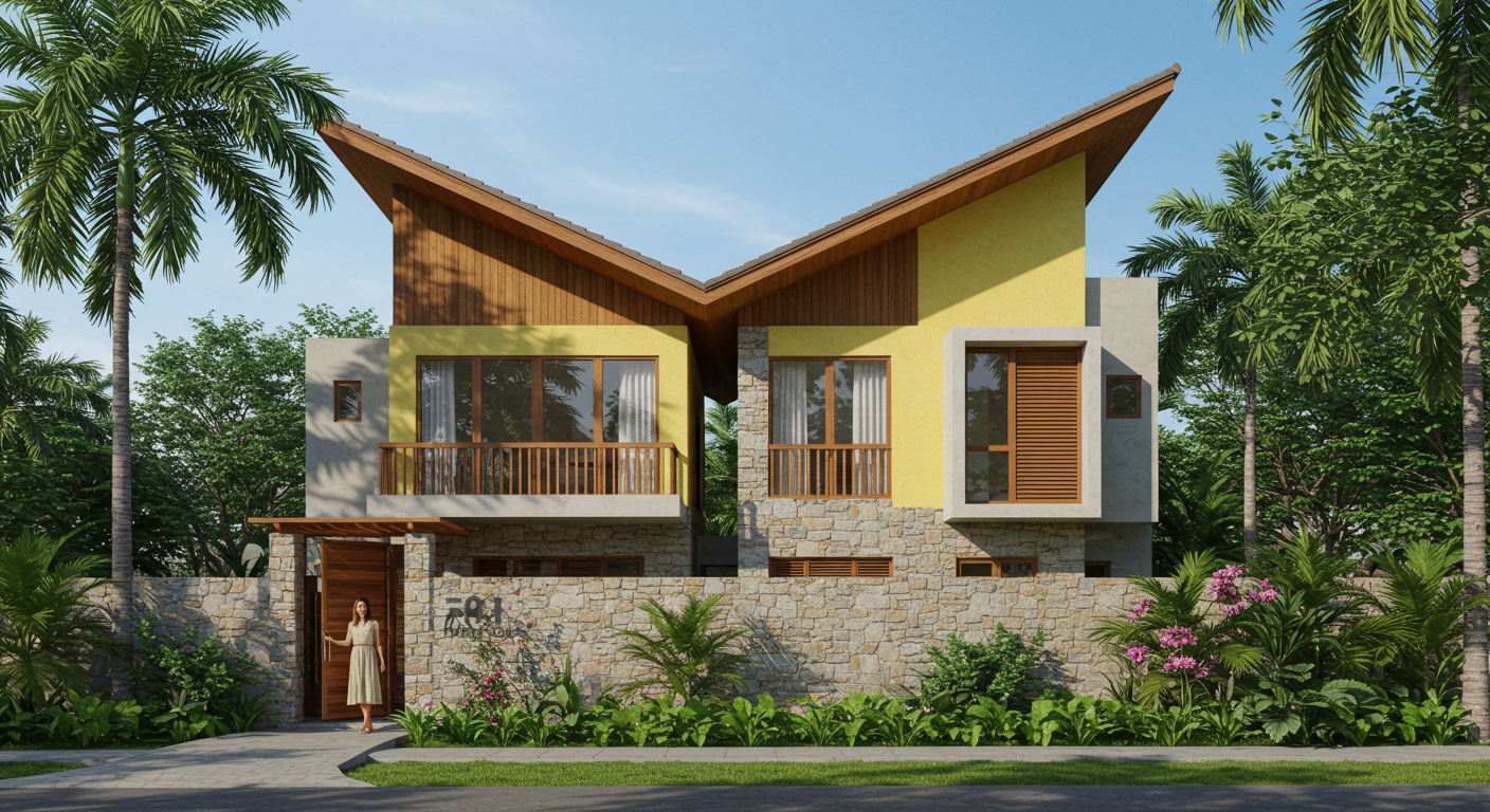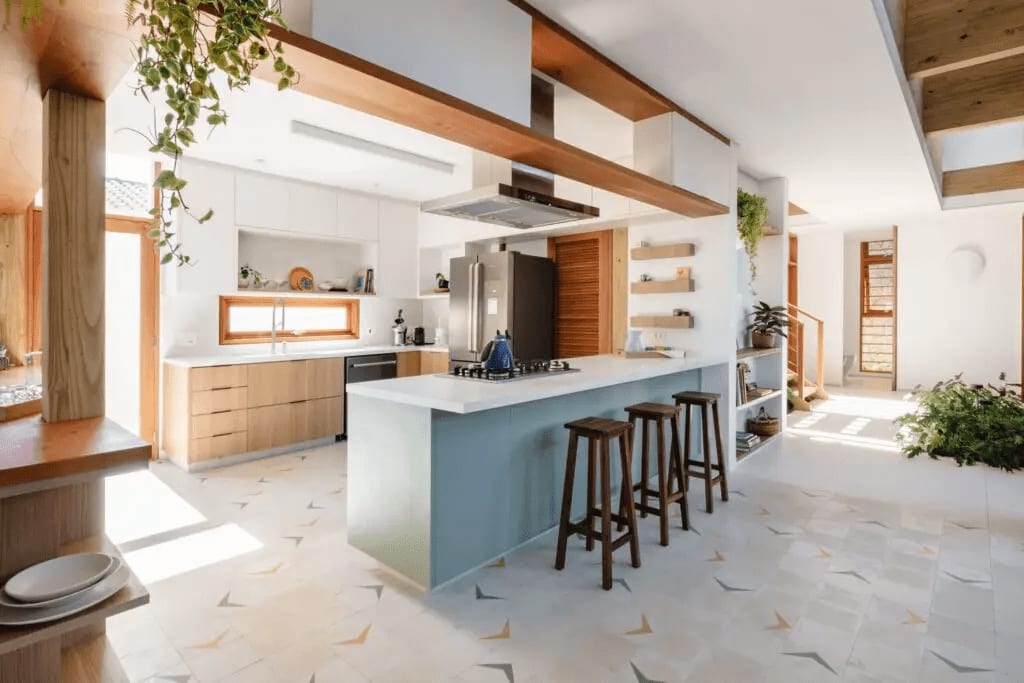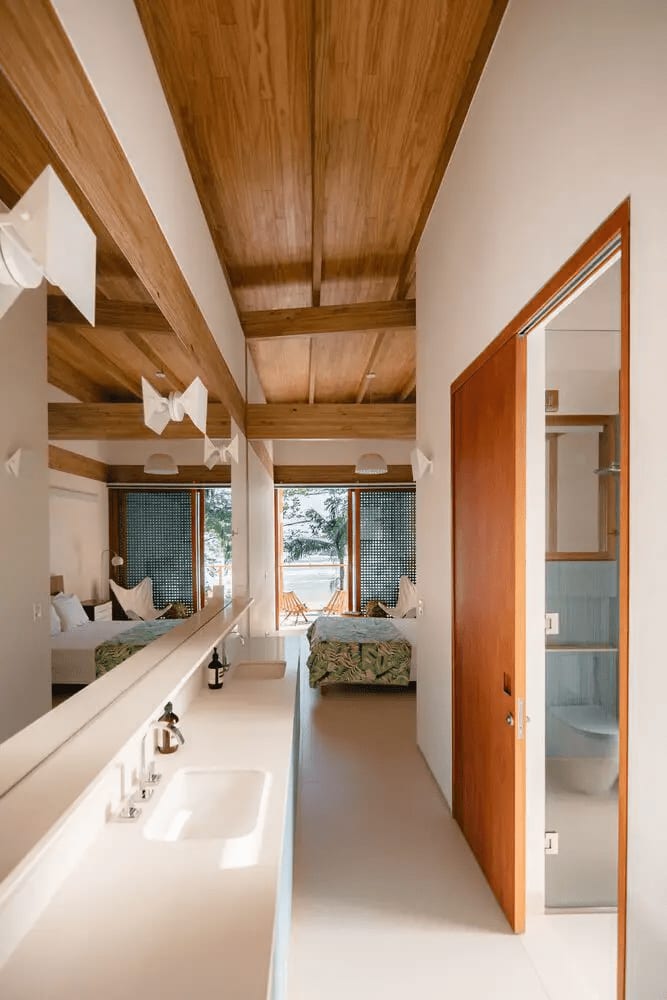Large eaves characterize the house’s facades, wrapping around the entire perimeter. These overhangs serve a dual purpose: they protect the structure, walls, and windows, thereby reducing maintenance needs, and they enhance the house’s aesthetic appeal. Openings are strategically placed to create a cross-ventilation axis, ensuring optimal thermal comfort throughout the interior.
