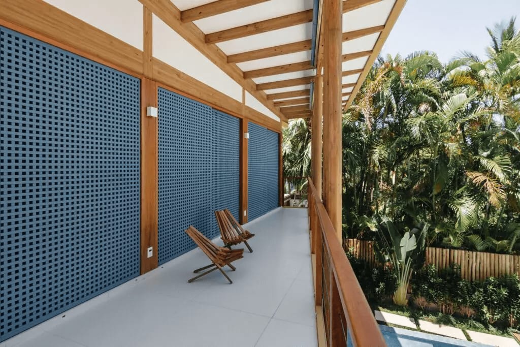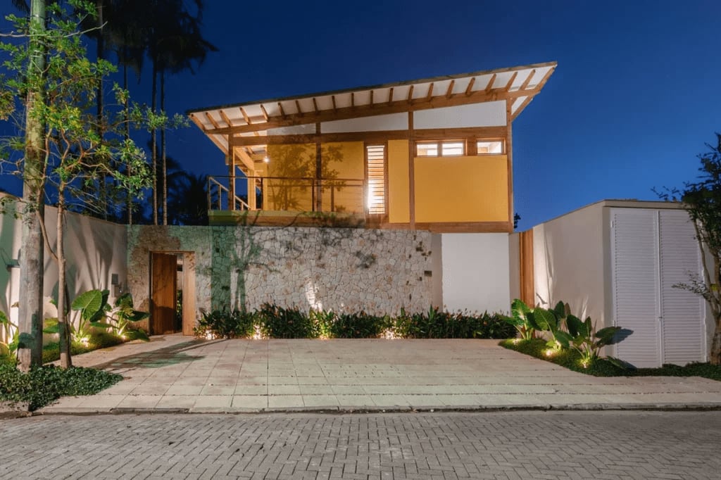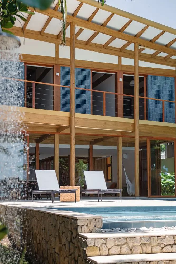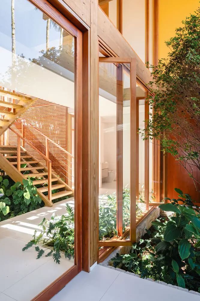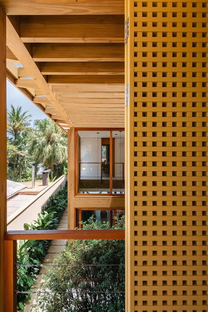Color plays a significant role in the house’s design too. The natural hue of the wooden structure is already striking, but the architects accentuated this by using bold shades of blue on the upper floor facing the sea and vibrant yellow on the block facing the street. These colors highlight the architectural elements and reflect the lively, dynamic spirit of Juquehy.