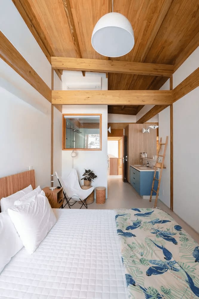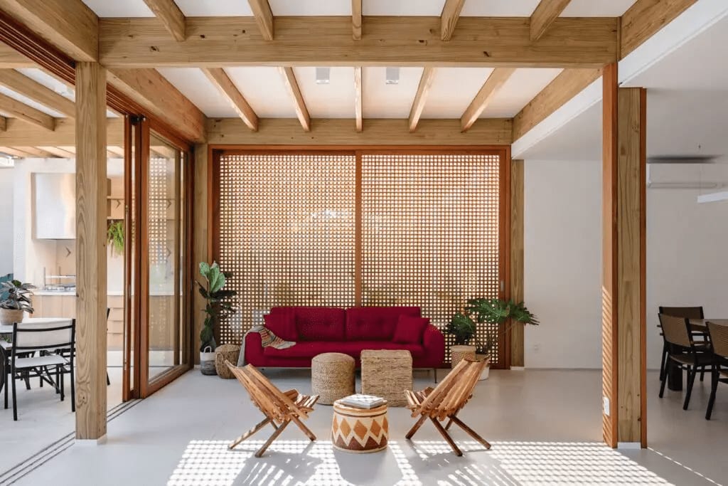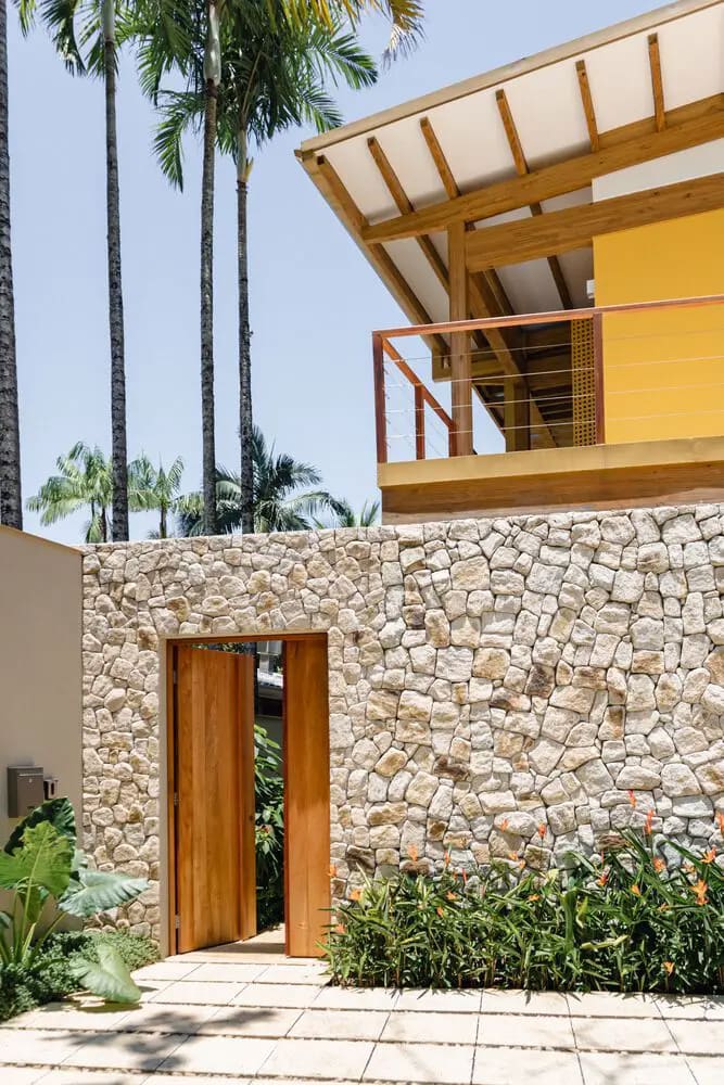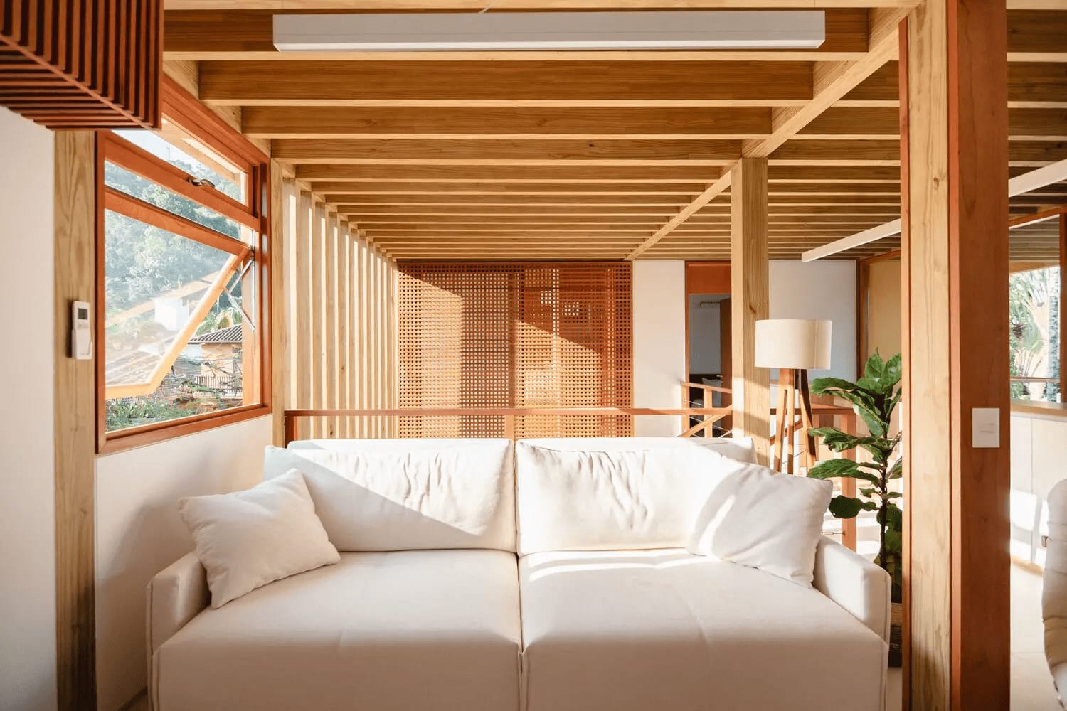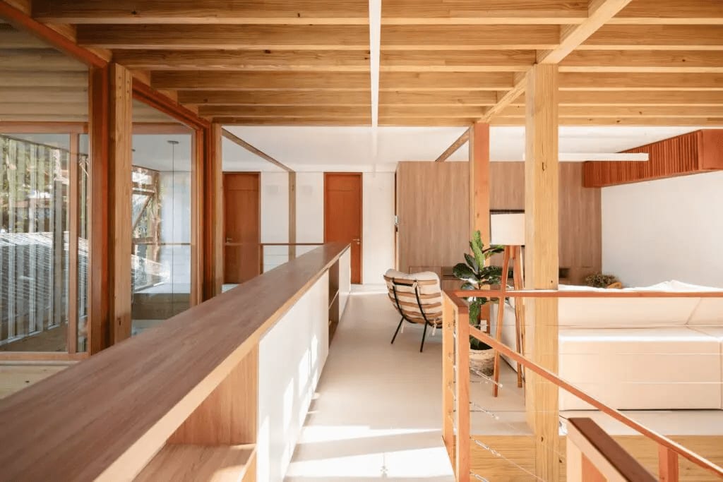 Color plays a significant role in the house’s design too. The natural hue of the wooden structure is already striking, but the architects accentuated this by using bold shades of blue on the upper floor facing the sea and vibrant yellow on the block facing the street. These colors highlight the architectural elements and reflect the lively, dynamic spirit of Juquehy.