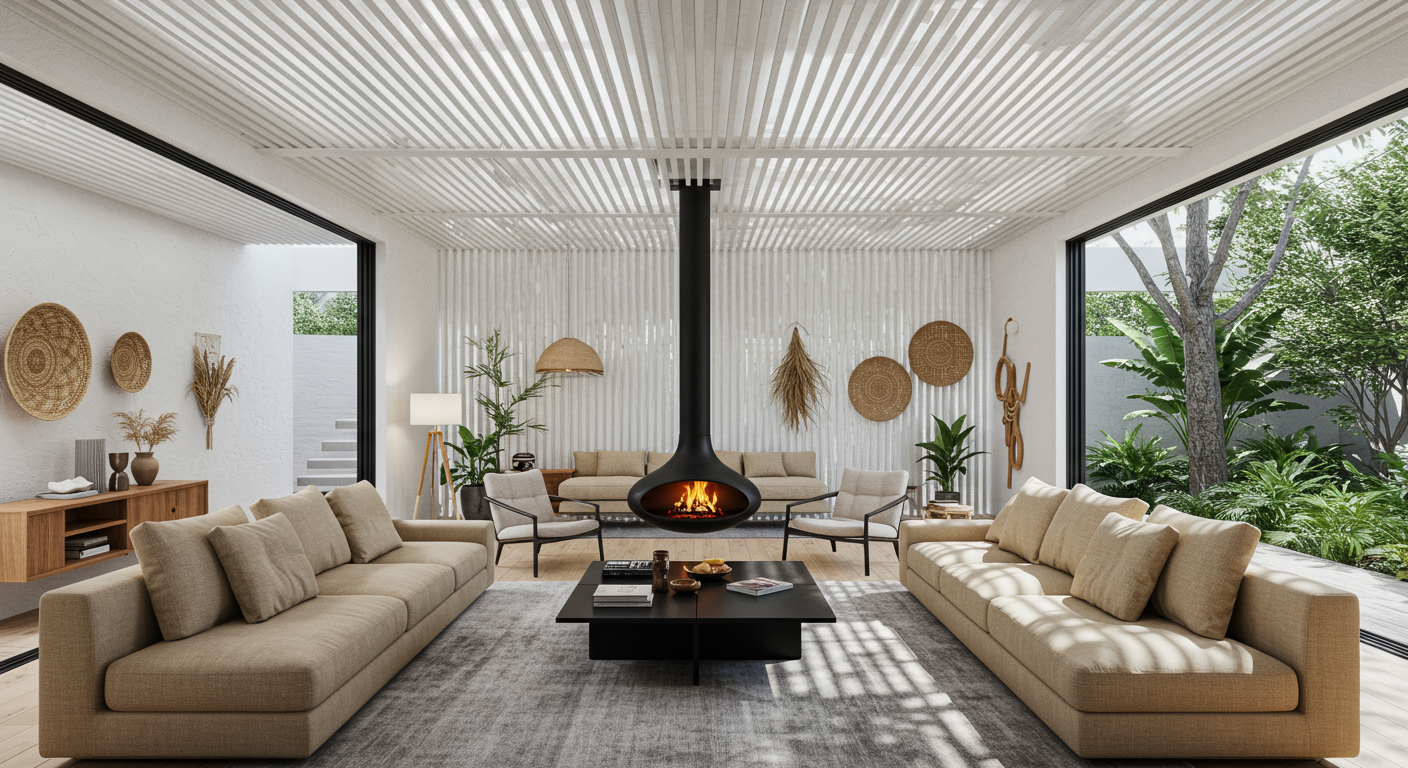 Clean lines mix with the organic at Sibipirunas House in São Paulo designed by Otto Felix Studio. The open-floor home includes two trees growing through the property, which had previously existed at the site. The plaster ceiling welcomes an abundance of light, further integrating the residence with the natural world.