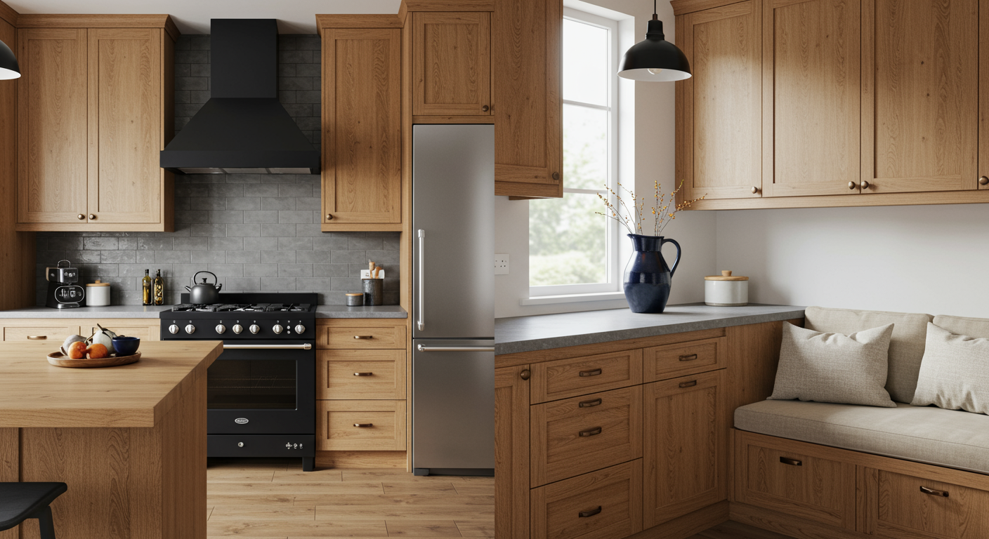 Wood cabinets are hitting all the marks. They add warmth and depth, and work well in any style kitchen. I am noticing more kitchen cabinets in natural woods paired with jewel-tone paint, metal, or stone. The wood creates a luxe look that is elegant and timeless. —Delia Kenza