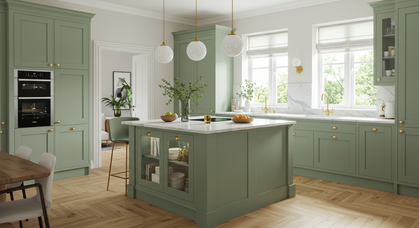 We found that cooler tones are being embraced when it comes to kitchen cabinet colors. Currently, we particularly feel strongly about olive green and are loving Rocky River by Sherwin-Williams. —Monet Masters and Tavia Forbes, Forbes + Masters