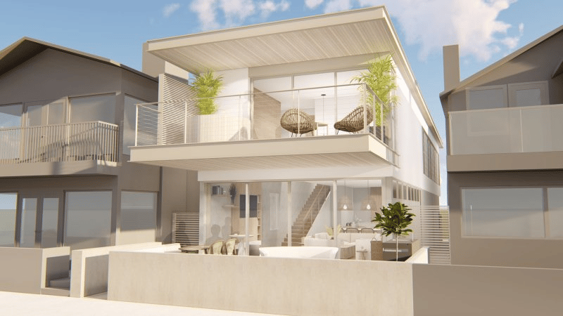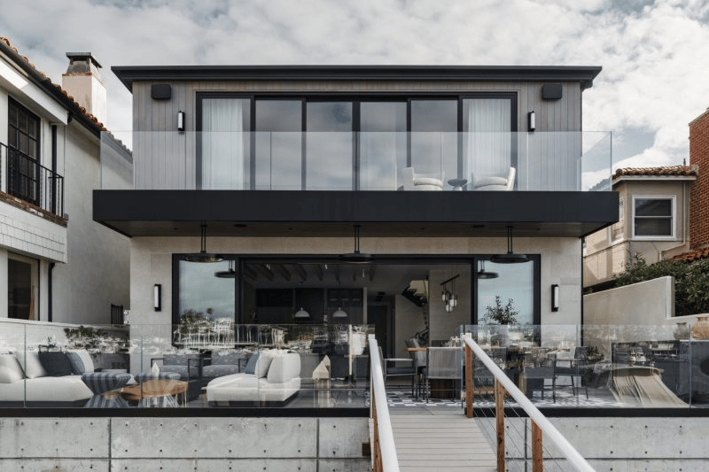 A harbor-side residence featuring sliding glass walls, rooftop deck, and fire pit, designed to bring indoor-outdoor living front and center, rooted in relaxed coastal luxury.