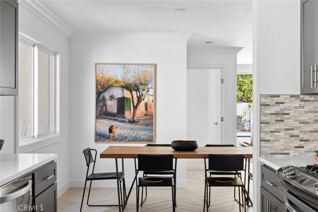 Inside, the open-concept layout is bathed in natural light, accentuated by expansive windows, recessed lighting, and elegant millwork. Herringbone-patterned floors lead you through the inviting living room, where a stacked stone fireplace sets the perfect tone for receiving guests. Accordion glass doors seamlessly connect to a private paradise, creating the ultimate indoor-outdoor experience. The chef-inspired kitchen is an ideal culinary destination, complete with stainless steel appliances, a chic backsplash, quartz countertops, and abundant cabinetry. A built-in work desk enhances its functionality, while the adjacent dining alcove provides a stylish space for gatherings.